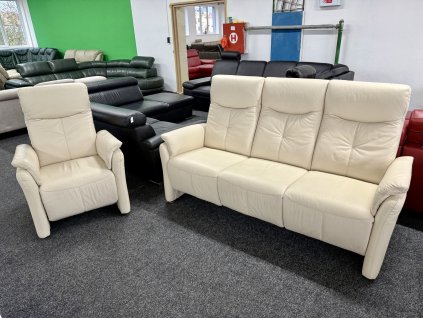 Elegantní celokožená sedací souprava se skládá z trojmístné pohovky a samostatného křesla. Jemná...
