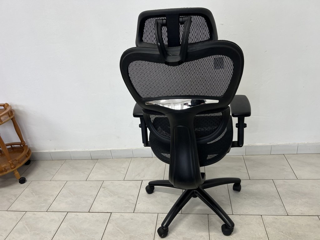 Kancelářské křeslo s polohovací funkcí, nastavitelnou výškou sedáku a opěrkou hlavy. Provedení je nepoužité. Konstrukce je doplněna o síťovaný potah a výškově nastavitelné područky.