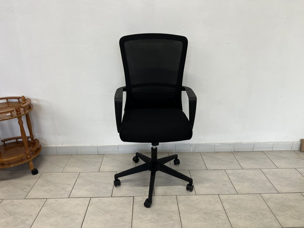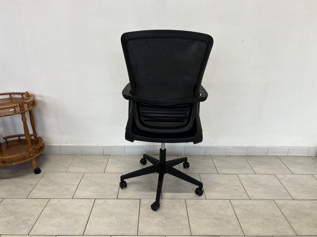 Kancelářská židle v látkovém provedení je vybavena polohovacím mechanismem a nastavením výšky sedu. Opěrák je ze síťoviny, sedák je potažen látkou. Područky jsou pevnou součástí konstrukce. Židle je nepoužitá.