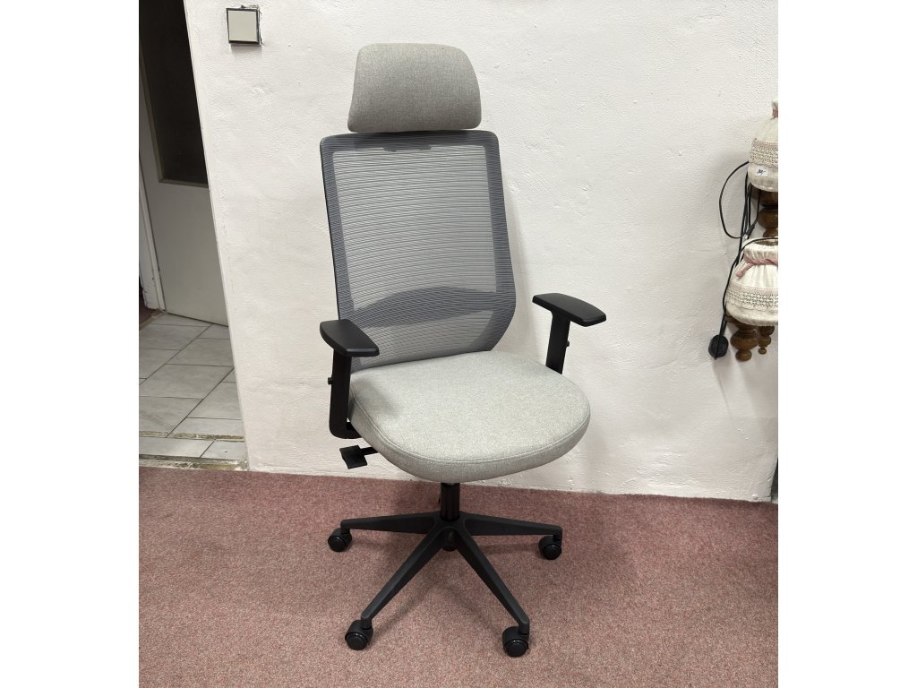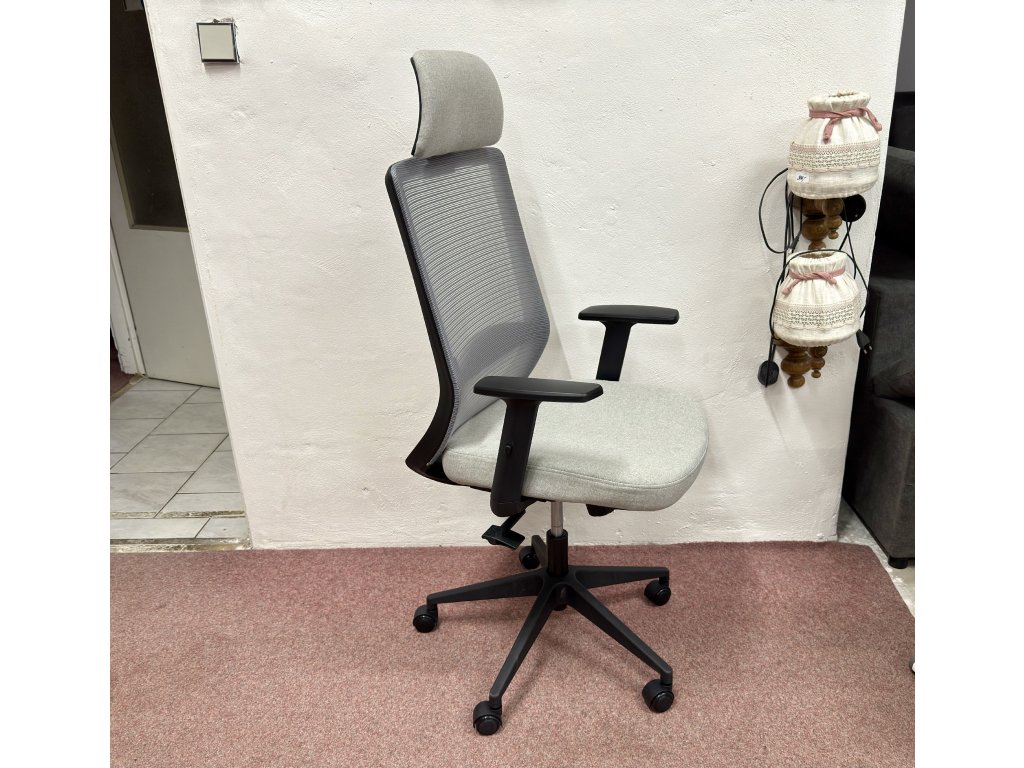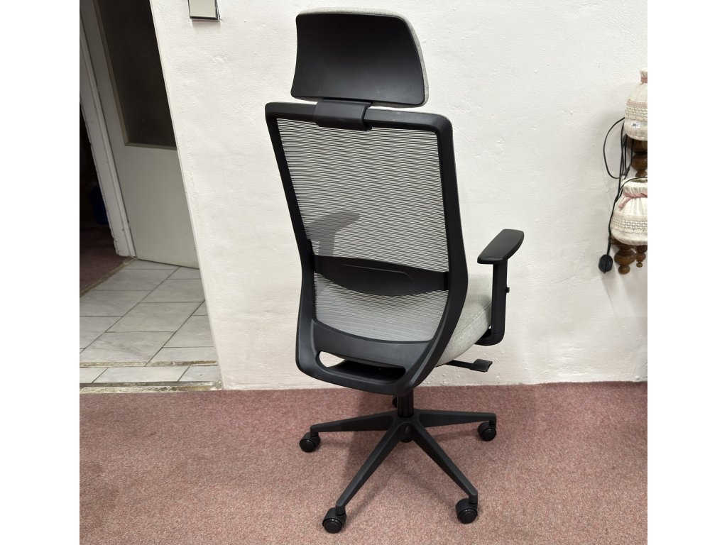 Kancelářská židle určená pro práci u stolu. Konstrukce je vybavena polohovací opěrkou hlavy, polohovacími područkami a nastavitelnou výškou sedu. Provedení je kombinací látkového sedáku a síťovaného opěradla. Stav nepoužité.