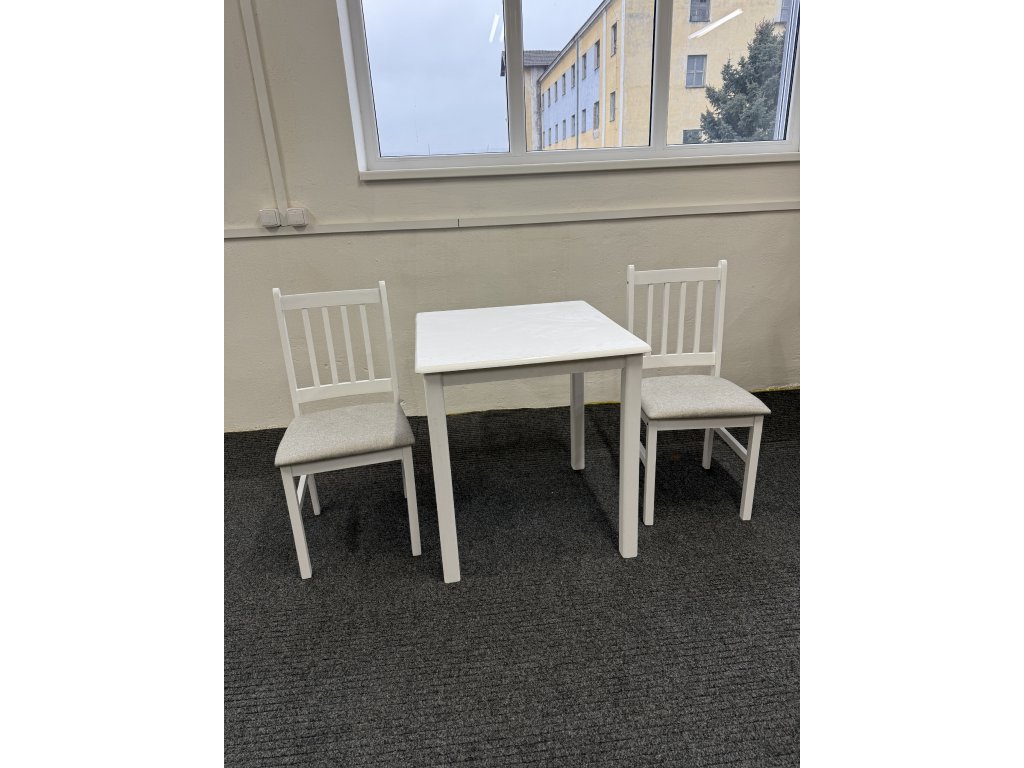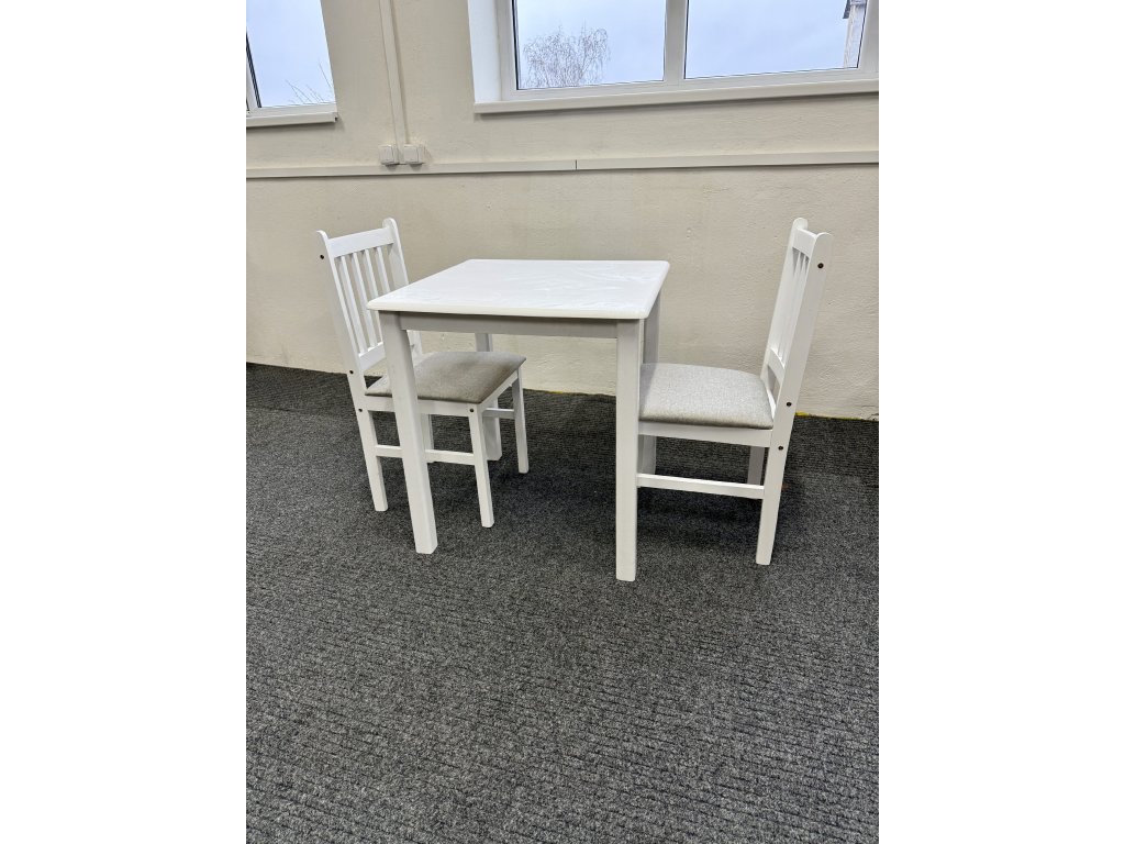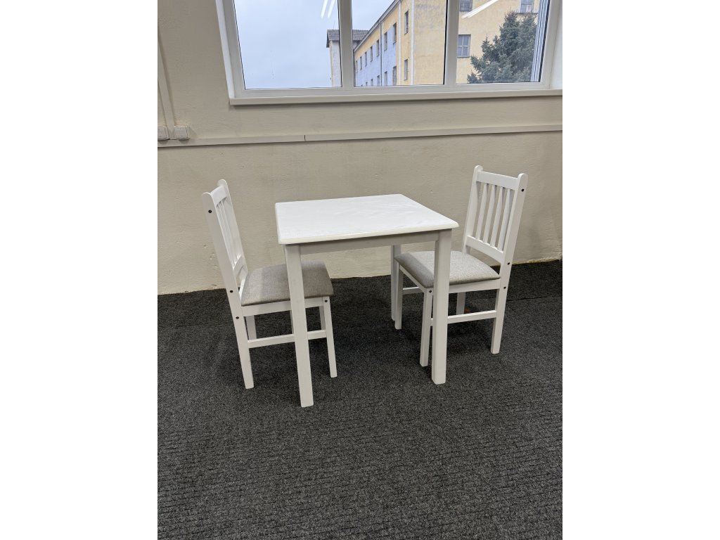 Jídelní set tvořený jídelním stolem a dvěma židlemi v masivním provedení. Set je určen pro menší jídelny, kuchyně nebo kuchyňské kouty. Provedení je nepoužité, pochází z výstavního kusu.