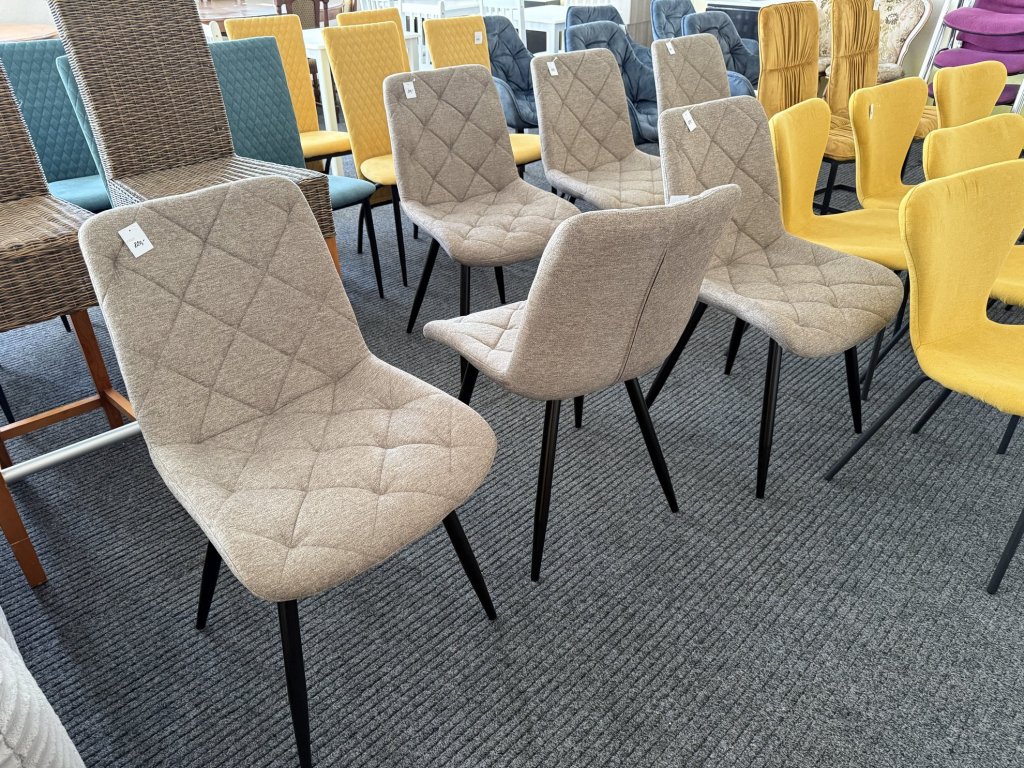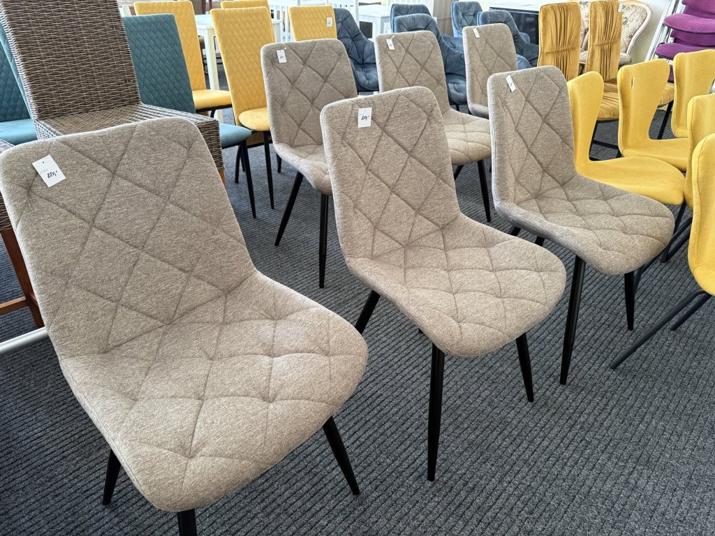 Jídelní židle s látkovým potahem a celočalouněným provedením. Konstrukce je doplněna čtyřmi kovovými nohami v černém provedení. Židle je nepoužitá a určena pro umístění k jídelnímu stolu nebo do kuchyně.