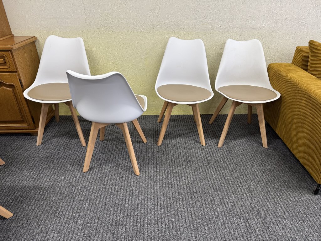 Židle mají tvarované plastové sedací skořepiny v bílé barvě. Sedák je doplněn o béžovou výplň. Nohy jsou z masivního dřeva v přírodním odstínu.