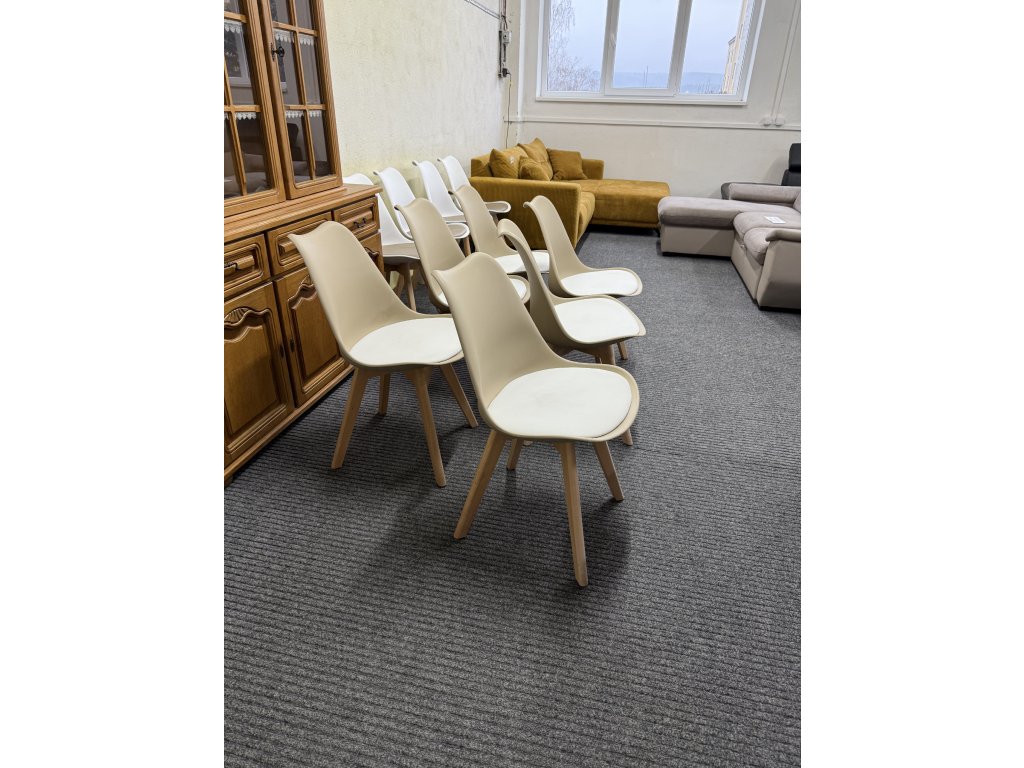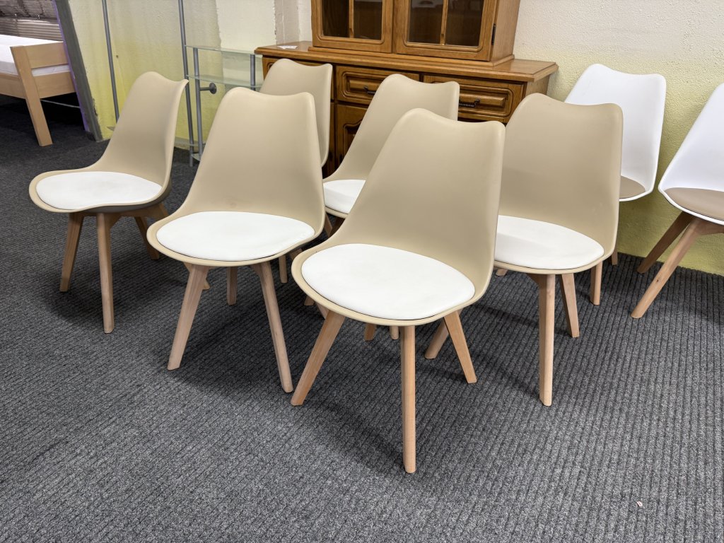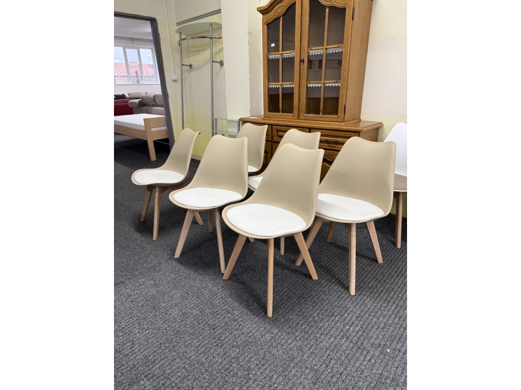 Skořepinové židle v béžové barvě doplněné bílým sedákem. Podnož tvoří čtyři dřevěné nohy v přírodním dekoru.