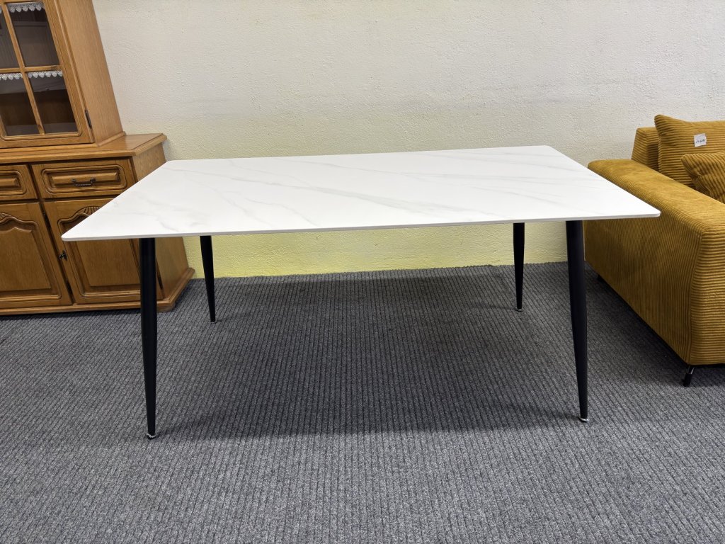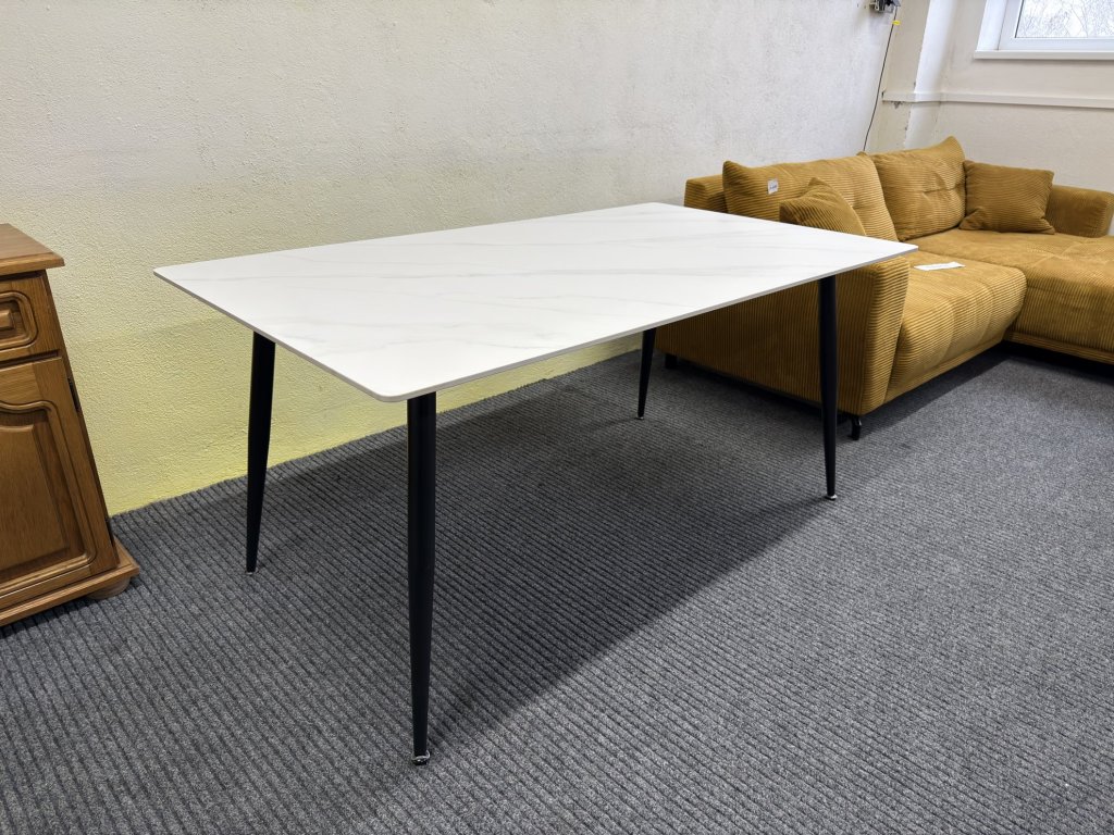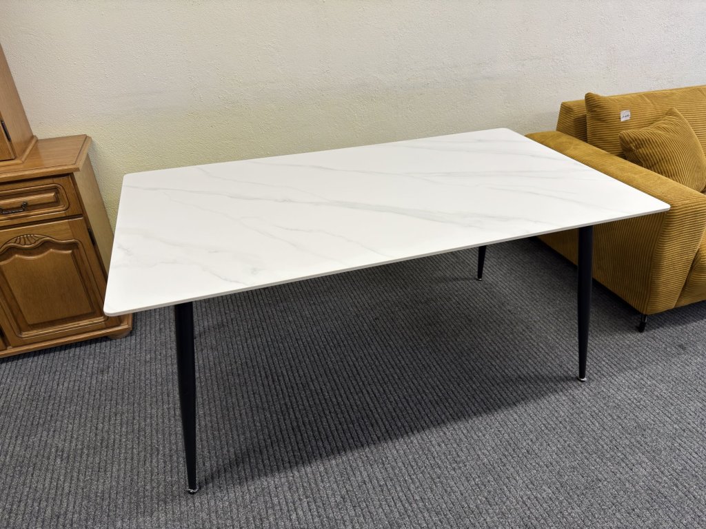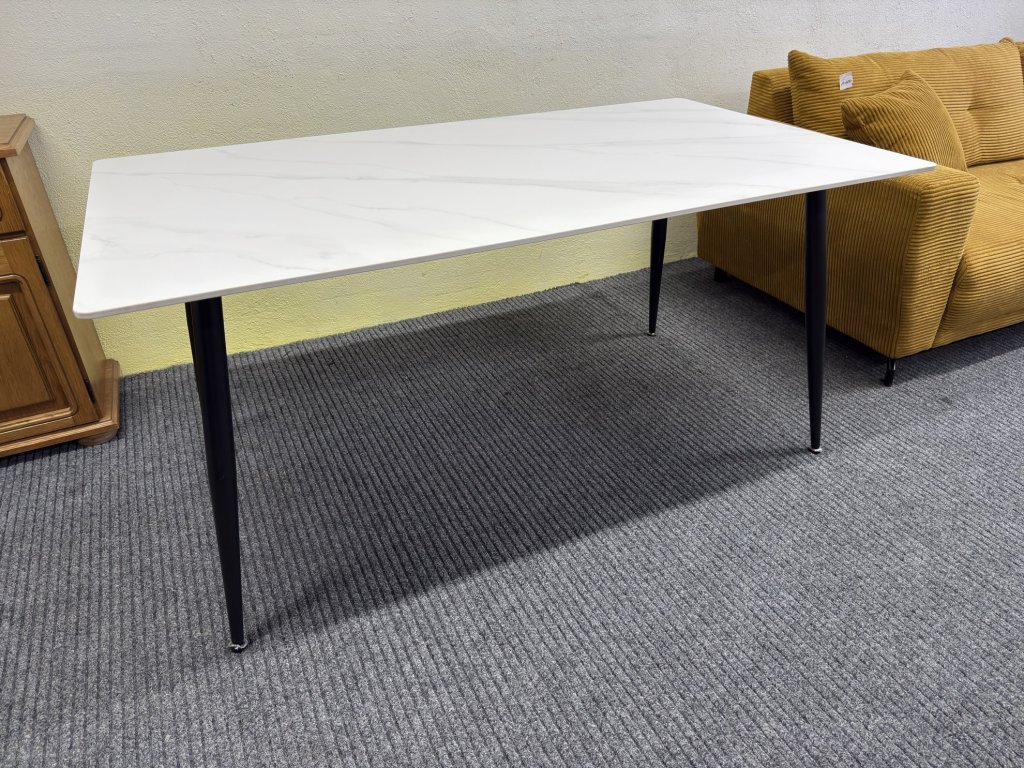 Stůl má desku v bílém dekoru s jemným mramorovým vzorem. Hrany jsou rovné, mírně zkosené. Nohy jsou černé, kuželovitého tvaru.