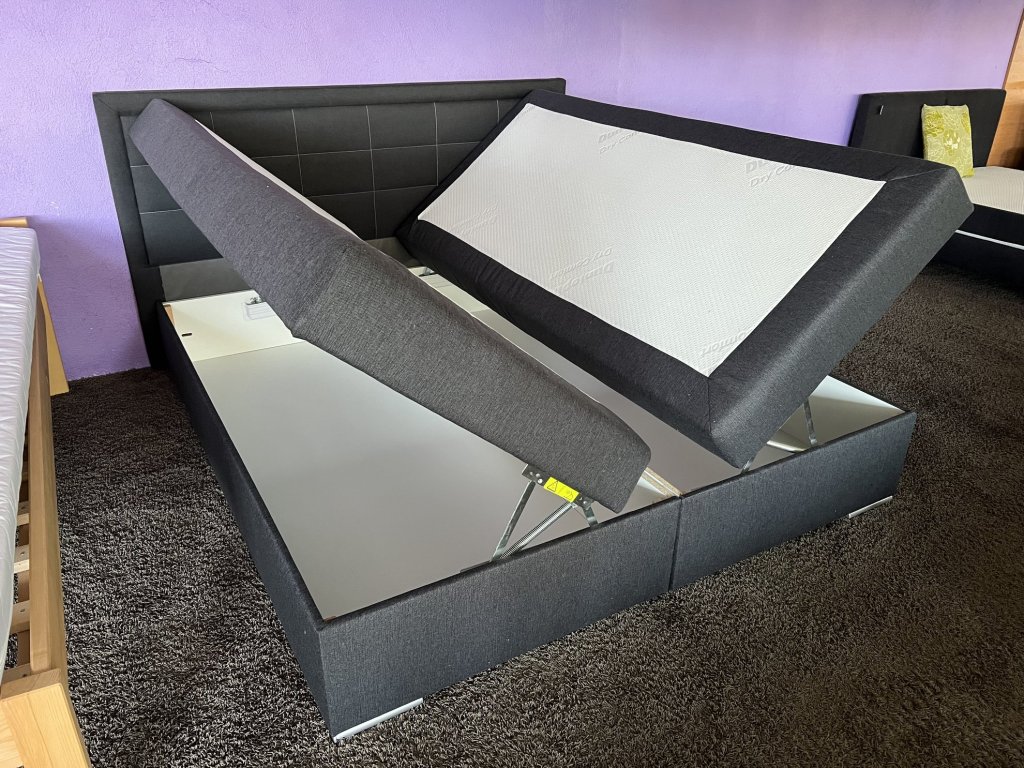 Čalouněná postel s úložným prostorem v tmavě šedém provedení. Součástí je výklopný rošt, který umožňuje přístup do prostorného úložného prostoru pod lůžkem. Postel má vysoké čelo a stabilní konstrukci z pevného rámu.