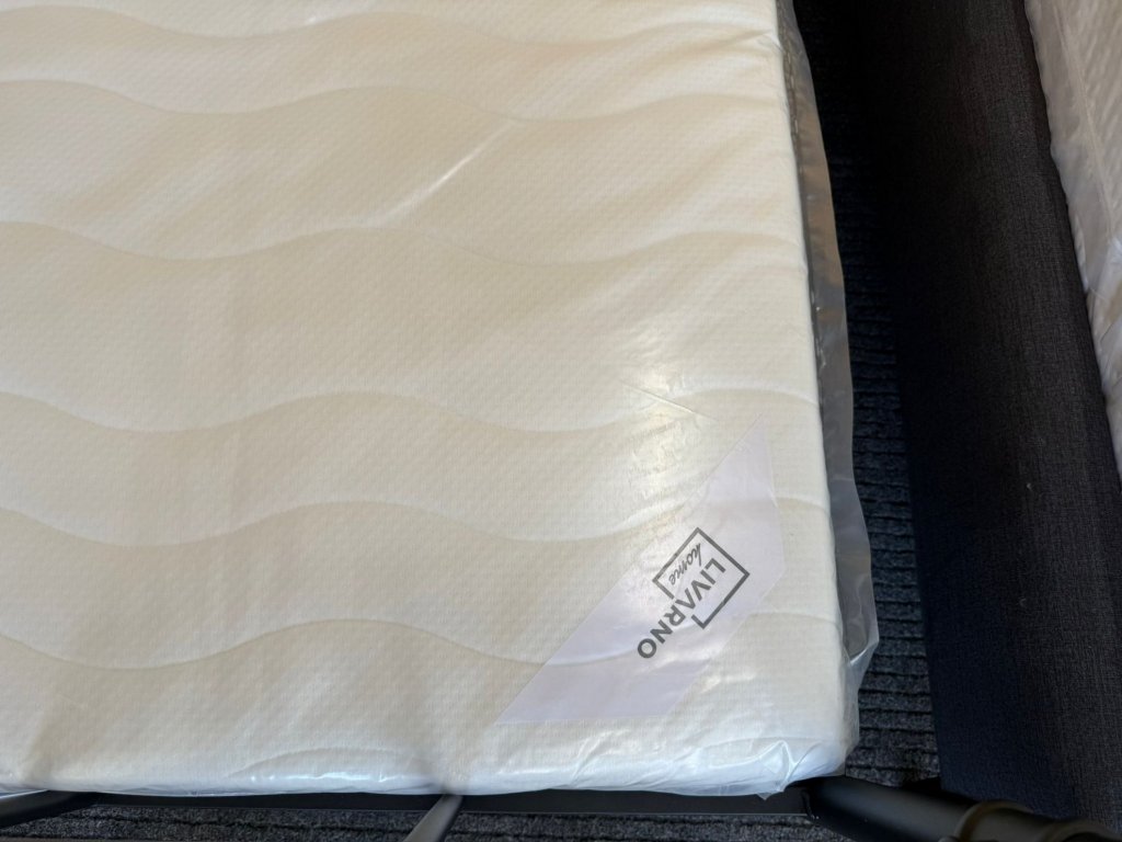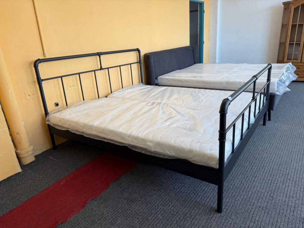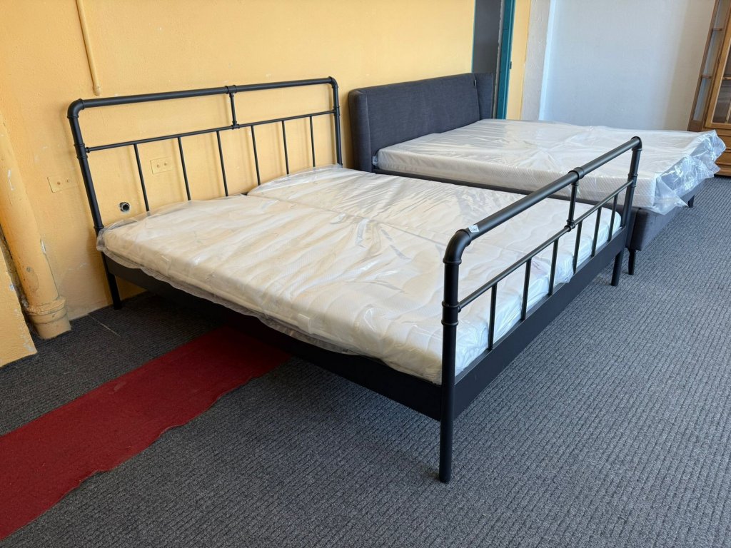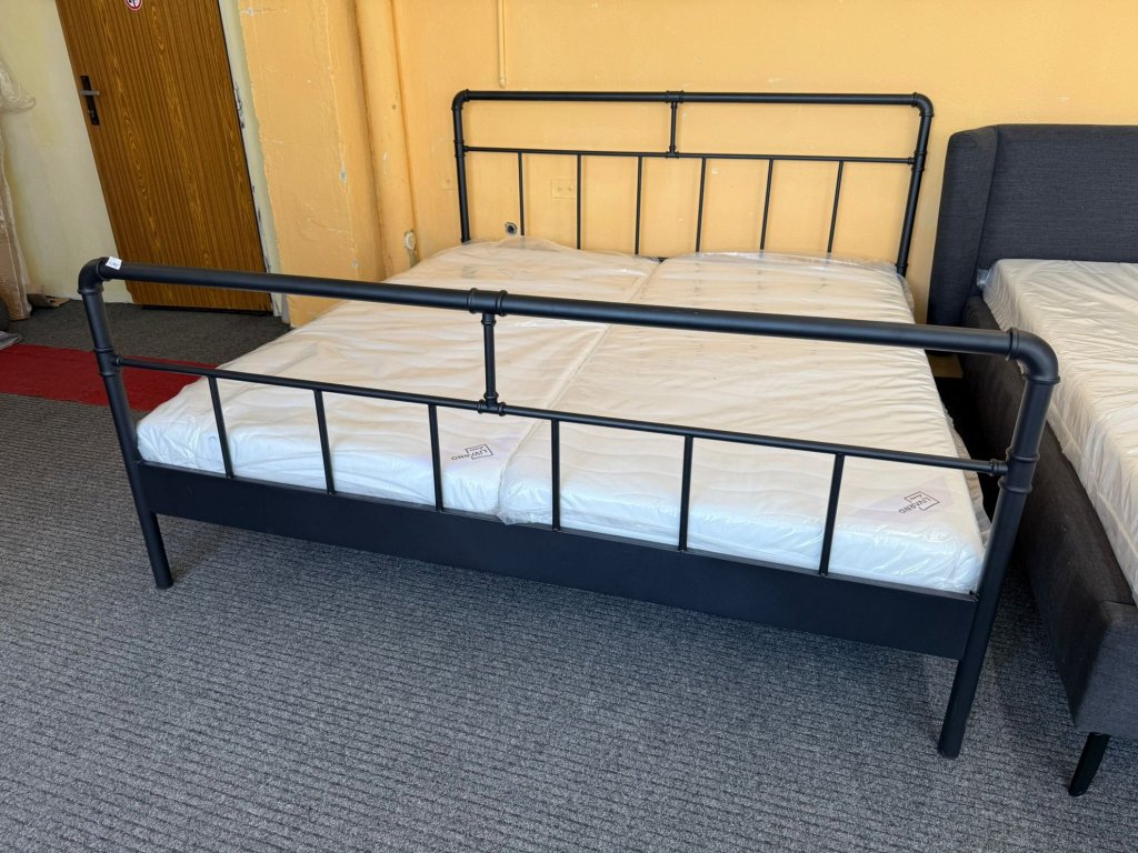 Moderní kovová manželská postel v černém provedení s roštem a matracemi. Praktické řešení a minimalistický vzhled pro vzdušnou a stylovou ložnici.
