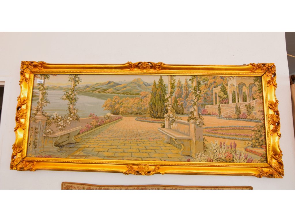 Krásný nástěnný gobelín ve zlaceném rámu.