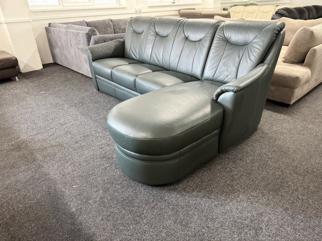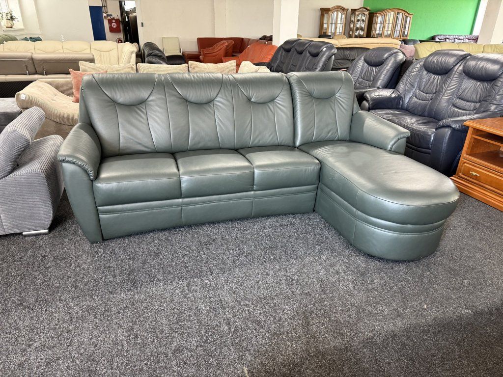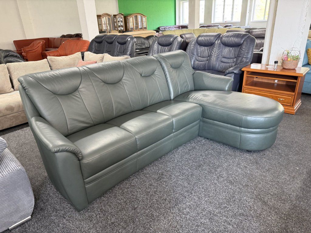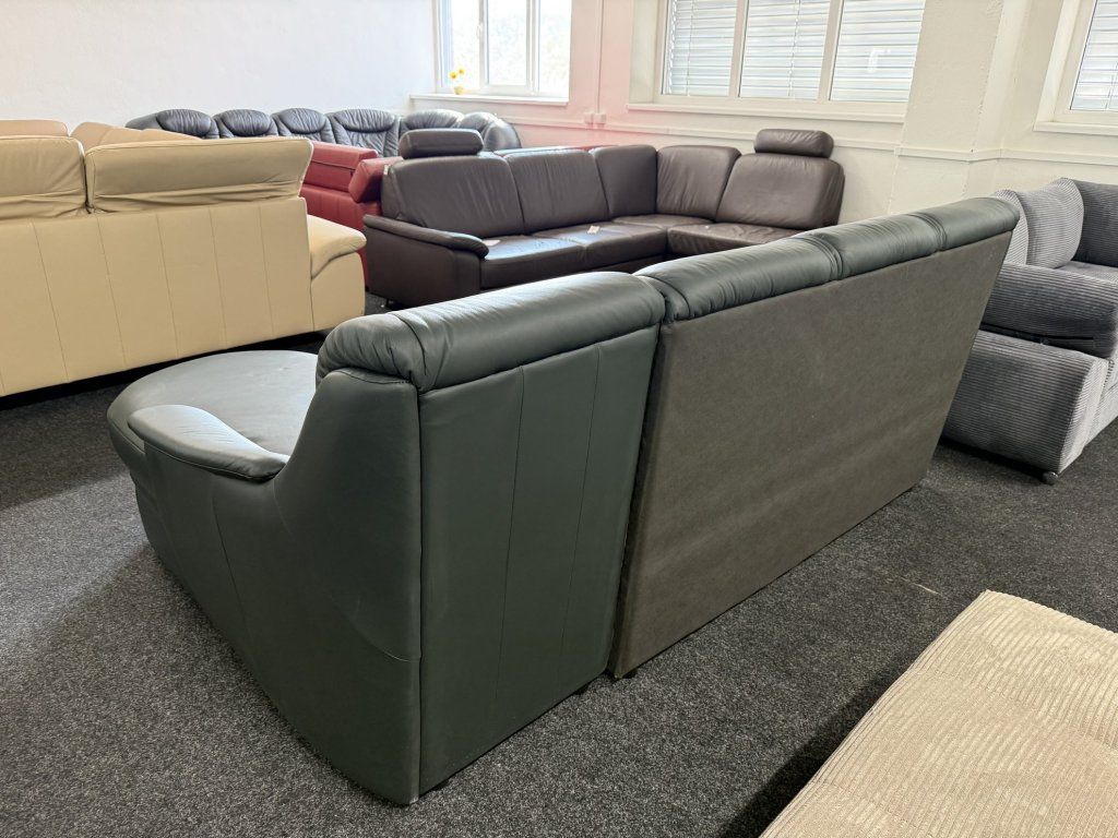 Rohová sedací souprava v koženém provedení. Sedačka je zánovní. Konstrukce není celočalouněná, zadní část není určena k umístění do prostoru. Souprava je řešena jako rohová sestava s pevnou sedací částí.