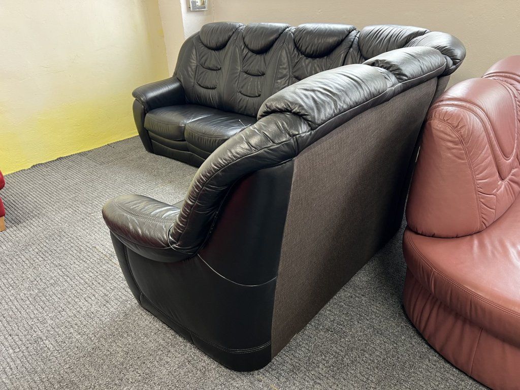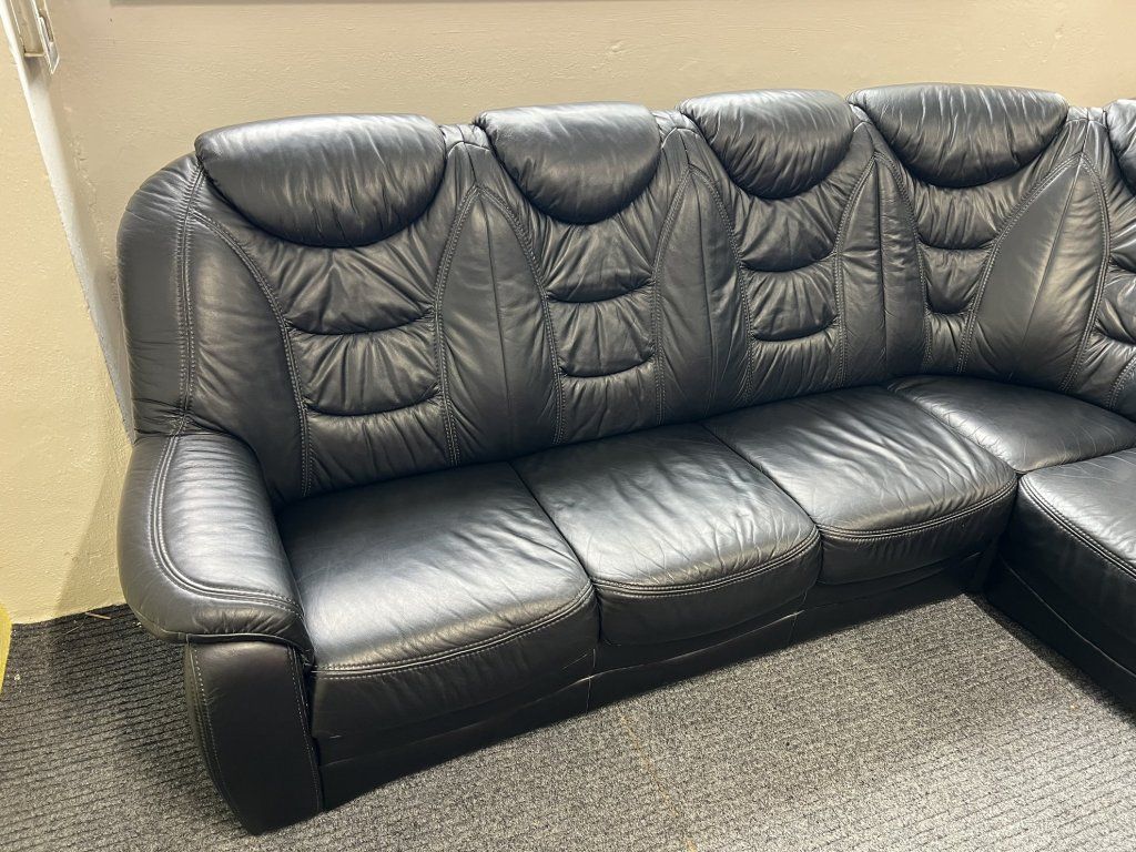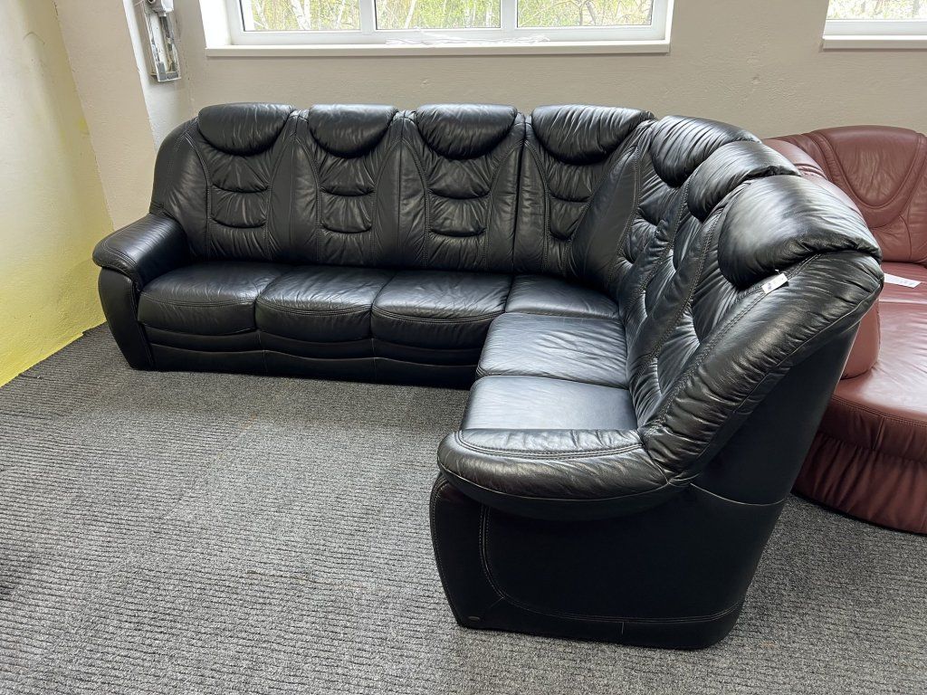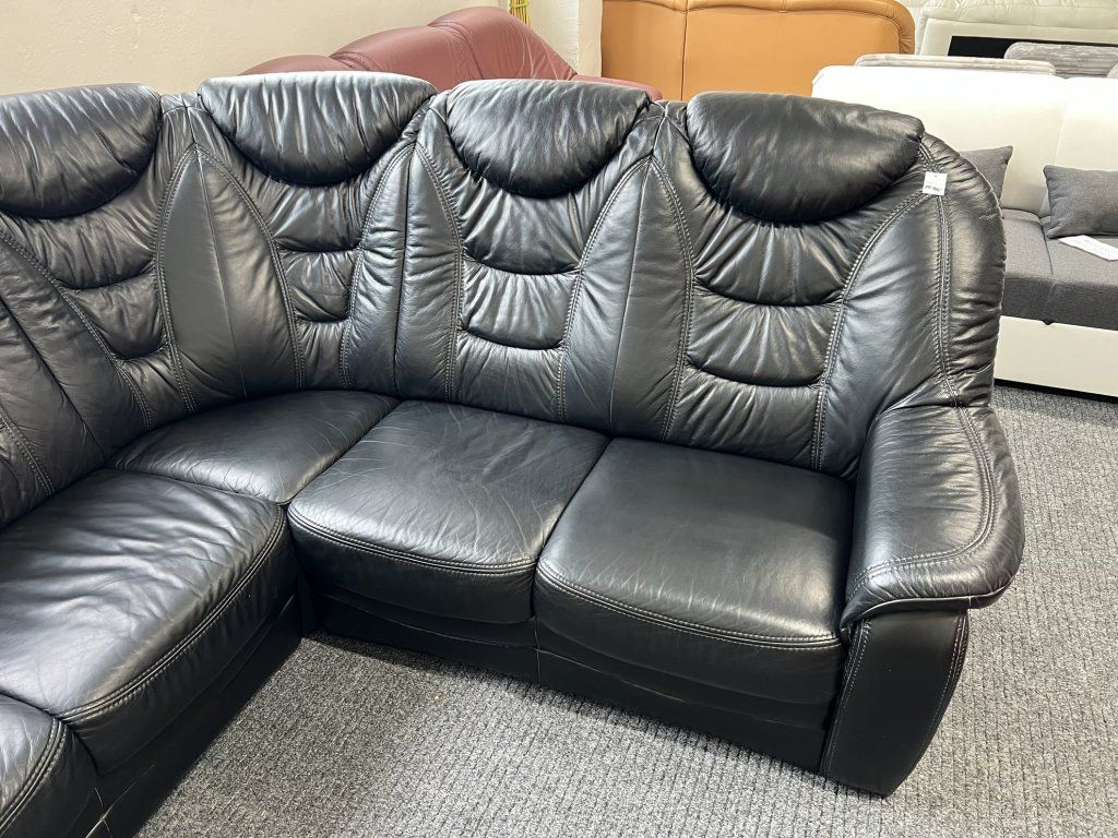 Rohová sedací souprava v koženém provedení. Sedačka není celočalouněná. Souprava je zánovní a je bez rozkládací funkce.