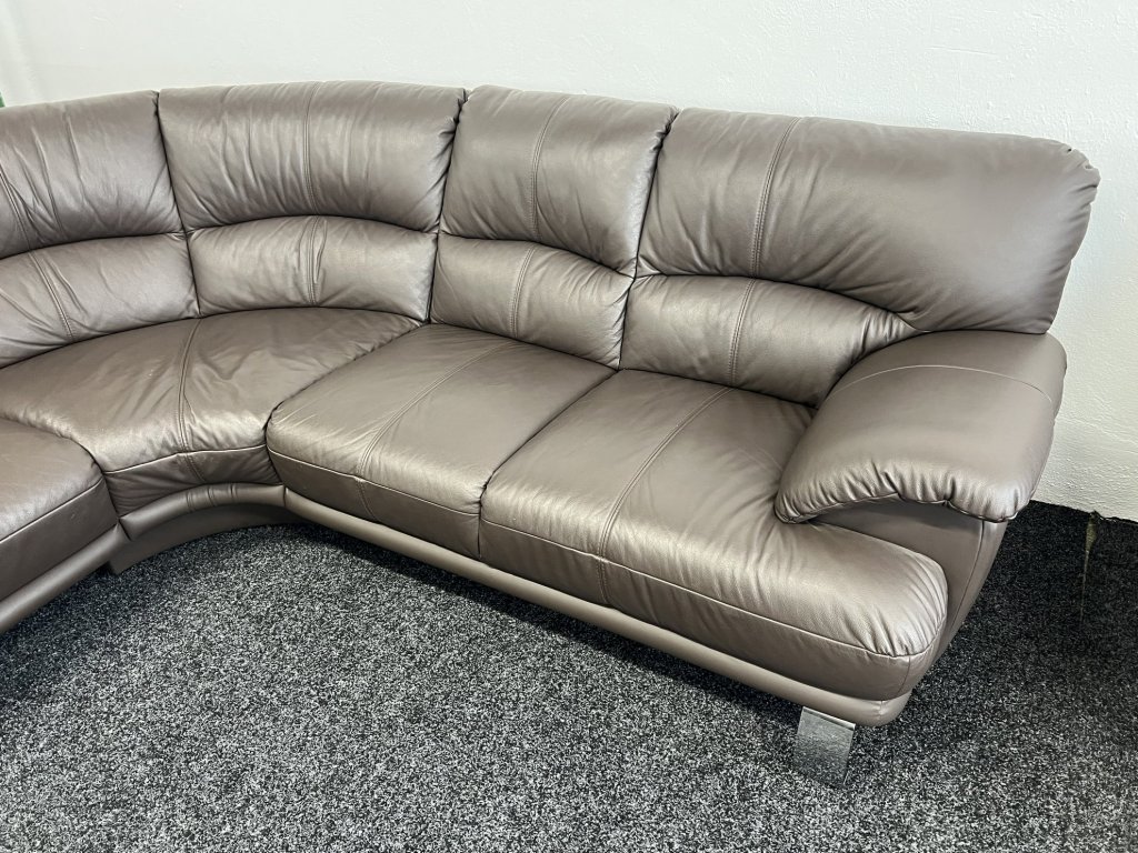 Rohová sedací souprava v koženém provedení. Sedačka je celočalouněná, vhodná k umístění do prostoru. Stav zánovní. Konstrukce je doplněna pevnými područkami a členěnými zádovými opěrkami. Souprava je určena pro každodenní sezení v obývacím prostoru.