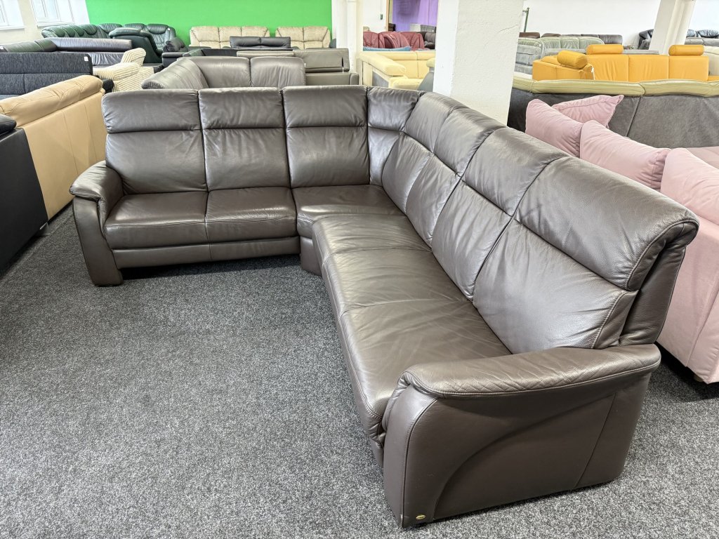 Rohová sedací souprava v koženém provedení. Sedačka je celokožená, tedy potažená pravou kůží i na zadních částech. Stav je zánovní. Rohové uspořádání umožňuje pohodlné sezení více osob.