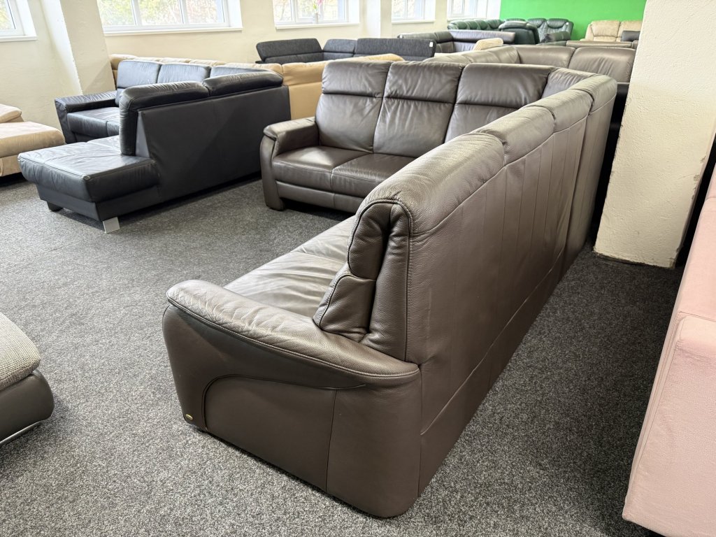 Sedací souprava má rohové provedení s plynule navazujícími sedáky a opěrkami. Kožený potah je v jednotném tmavém odstínu. Opěrky zad jsou členěny do horizontálních segmentů.