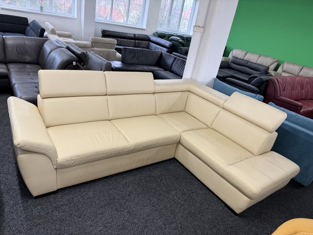 Sedací souprava má rohové provedení s hladkým koženým potahem. Opěrky zad jsou členěny do vodorovných segmentů a doplněny o samostatně polohovatelné hlavové opěrky.