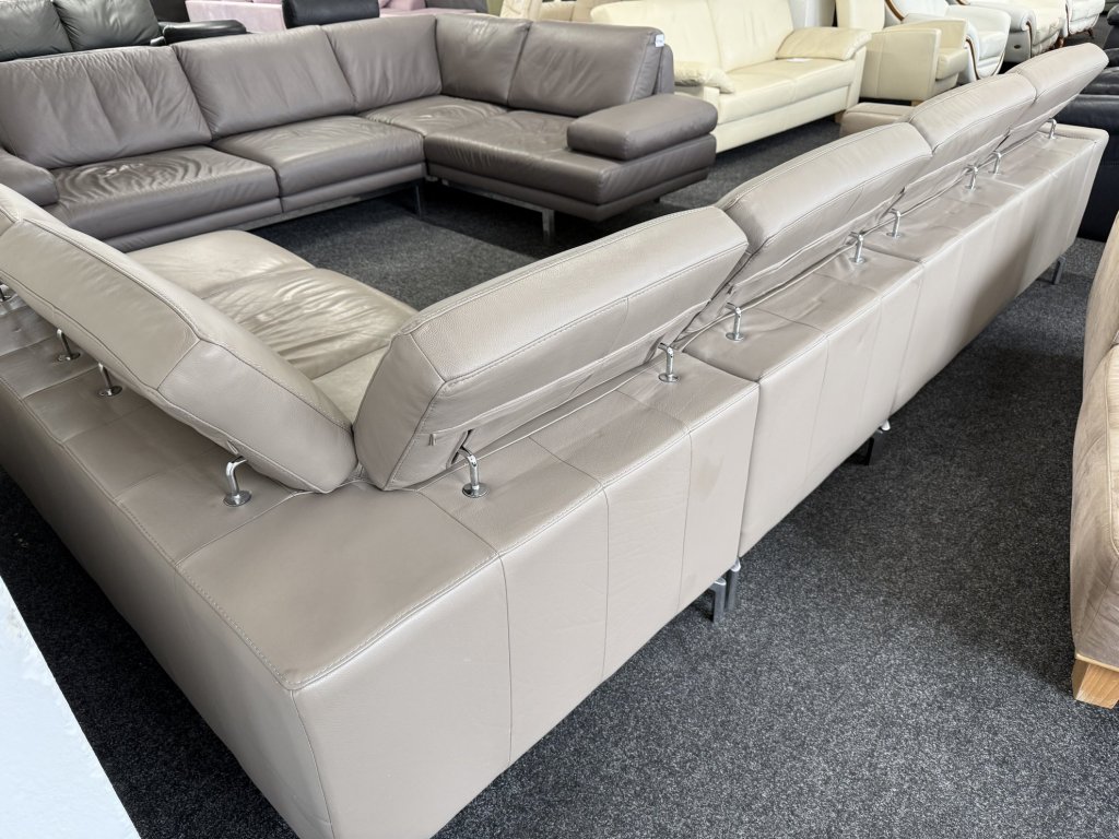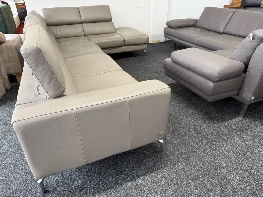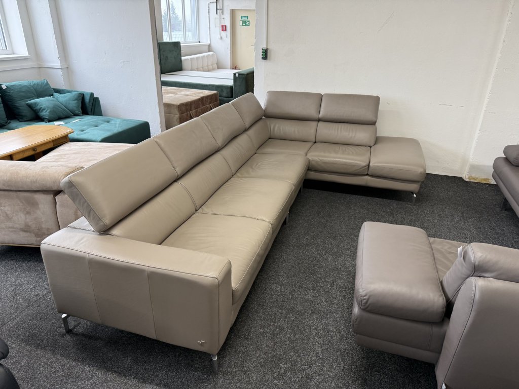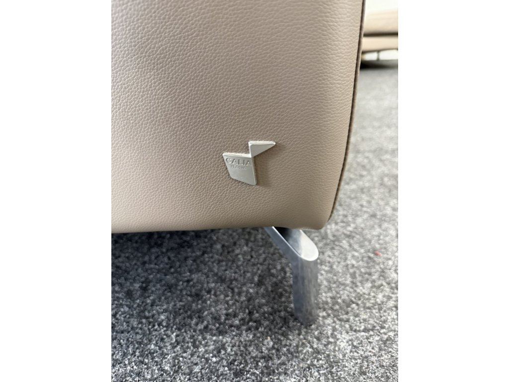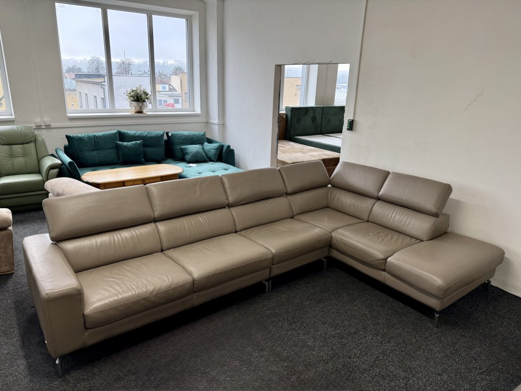 Rohová sedací souprava značky Calia v koženém, celokoženém provedení. Souprava je zánovní a vybavená polohovacími opěrkami hlavy. Provedení umožňuje variabilní nastavení opěradel dle potřeby. Sedačka je vhodná pro každodenní používání v obytných prostorech.