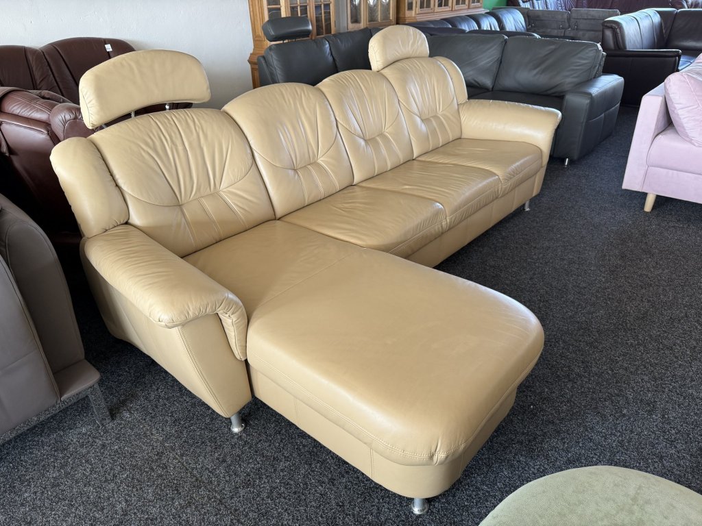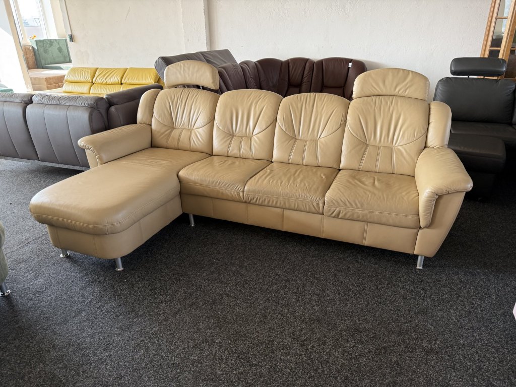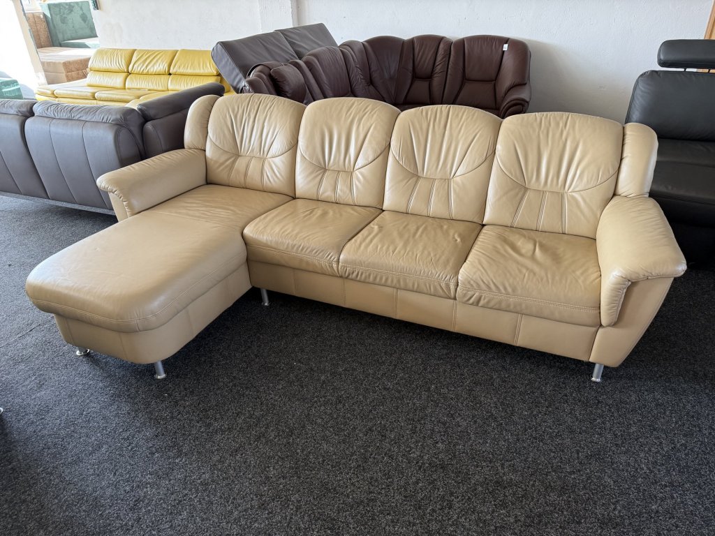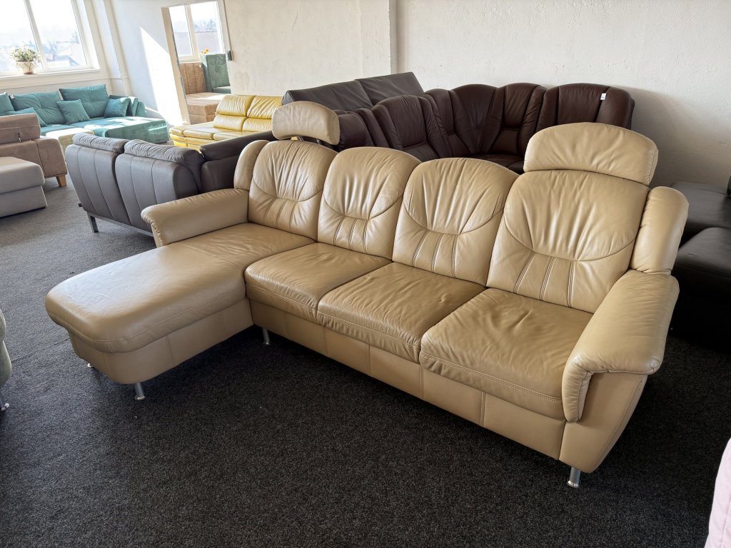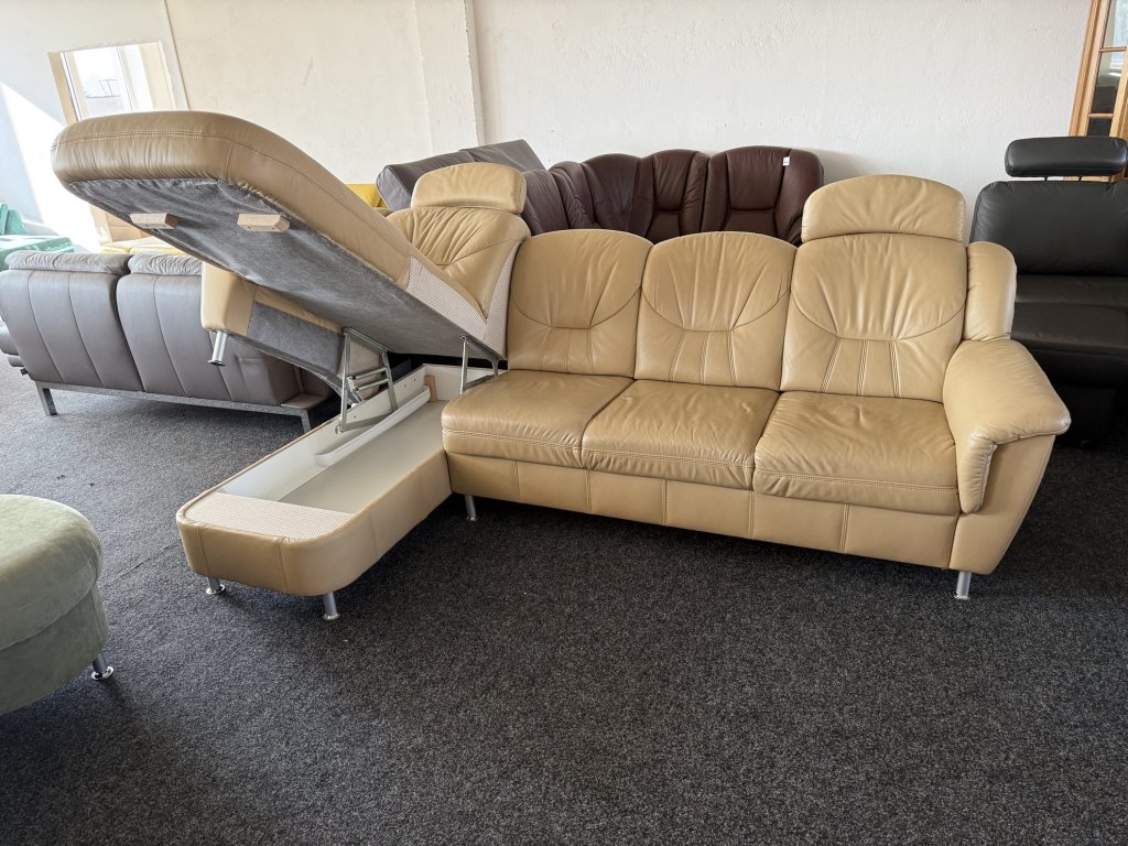Rohová kožená sedací souprava s úložným prostorem v levém provedení. Vhodná do obývacího pokoje s umístěním ke stěně.