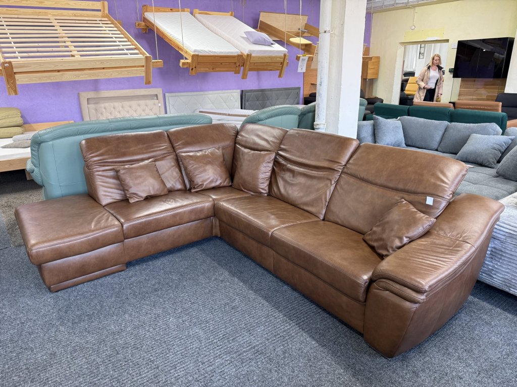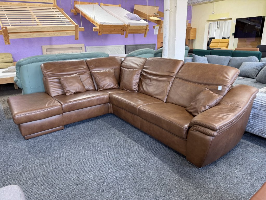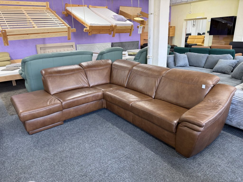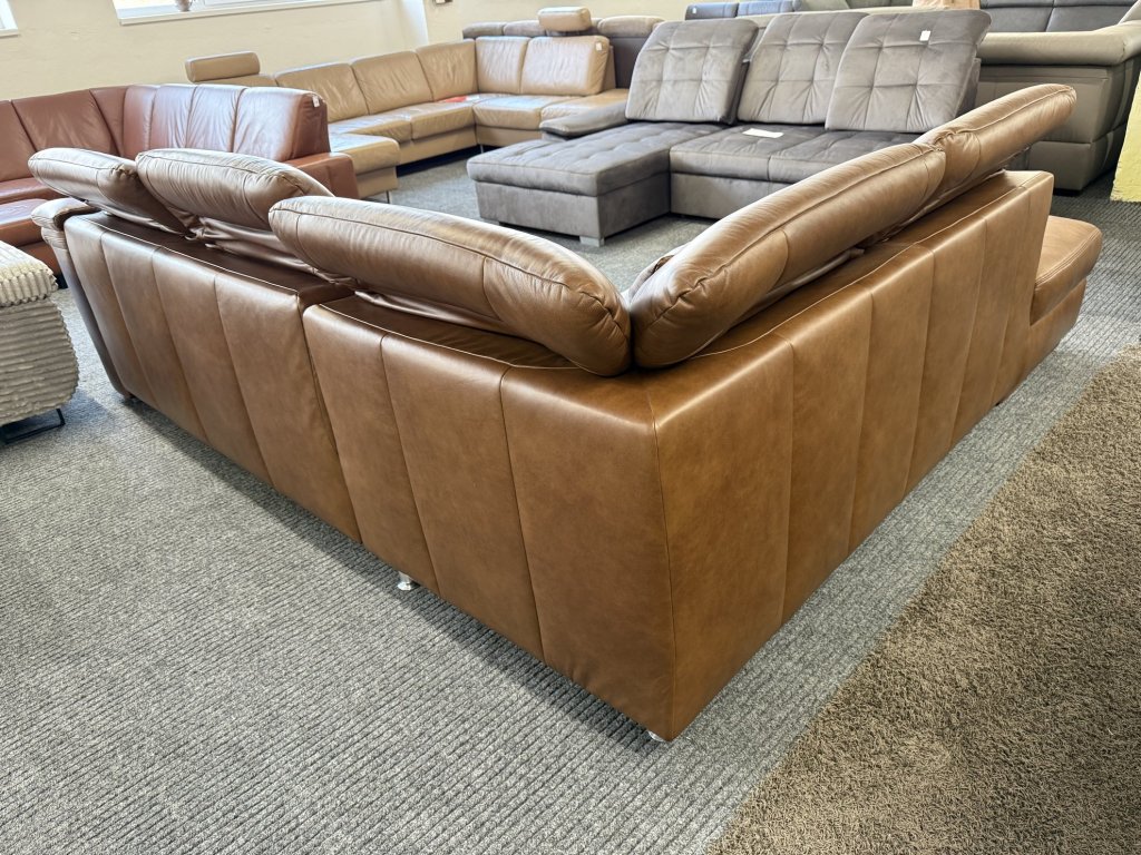 Rohová sedací souprava s koženým potahem a polohovacími opěrkami hlavy v celočalouněném provedení.