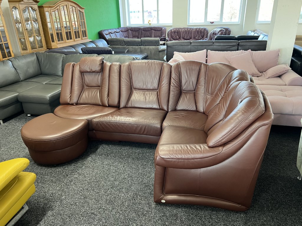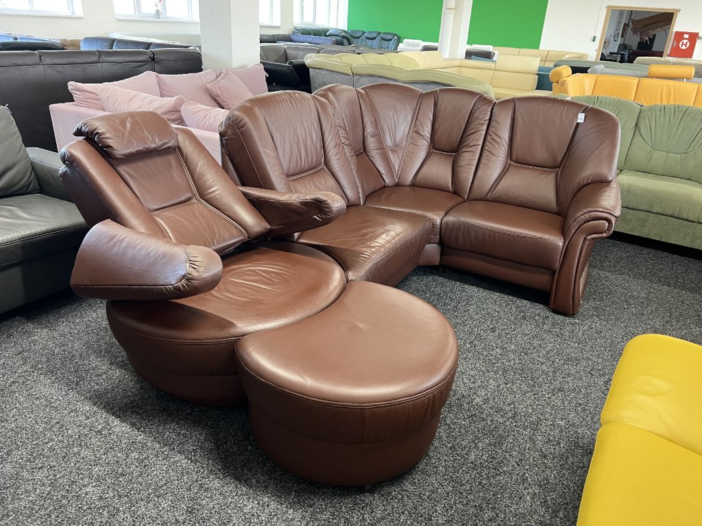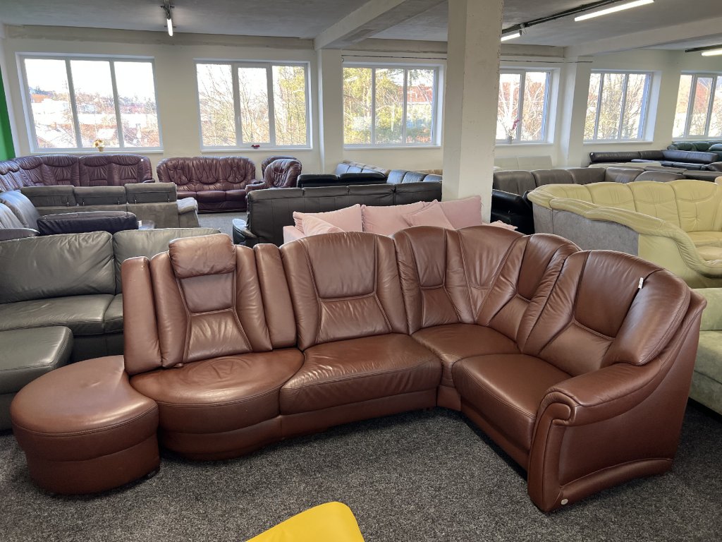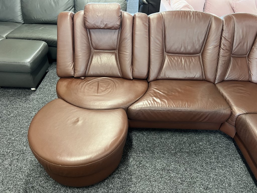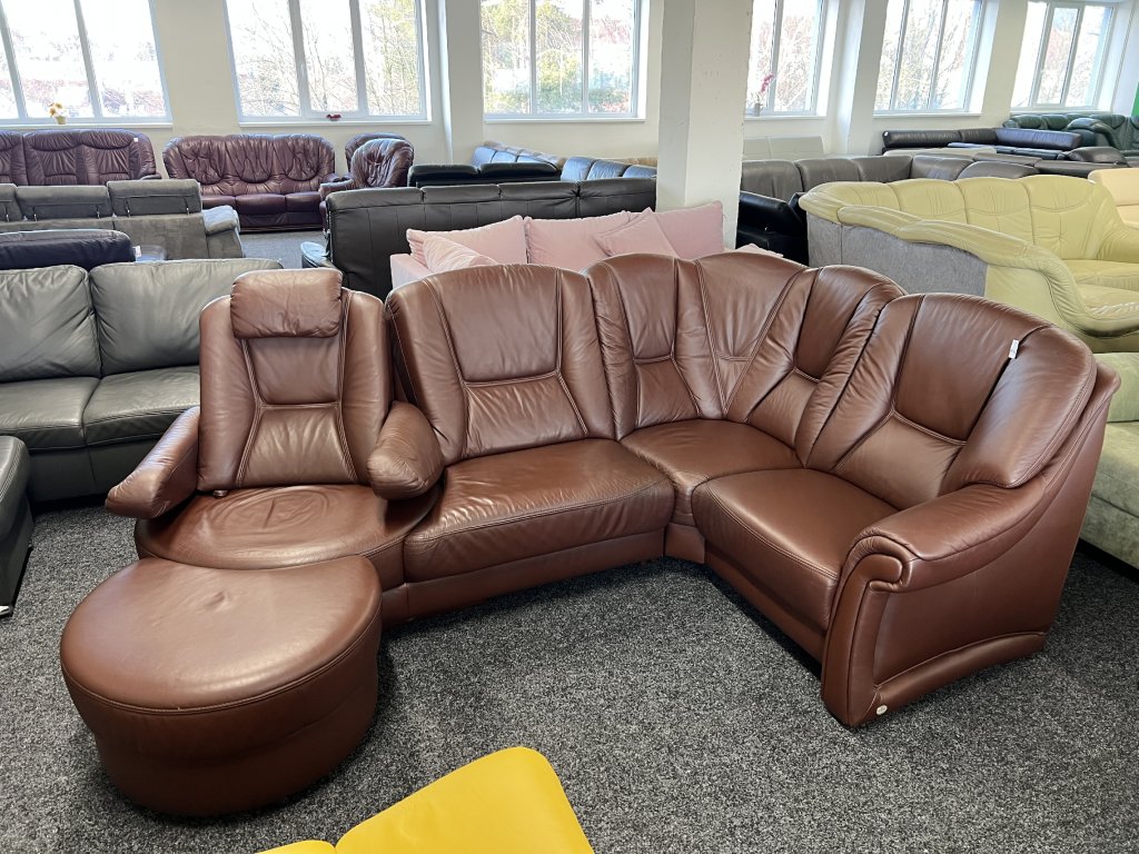 Rohová sedací souprava značky Himolla je vyrobena z pravé kůže v hnědém odstínu. Součástí sestavy je samostatný taburet a otočné zakončení s polohovatelným sedákem. Sedačka není celočalouněná. Stav zánovní.