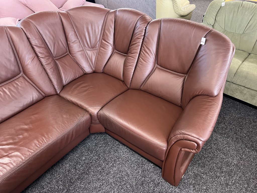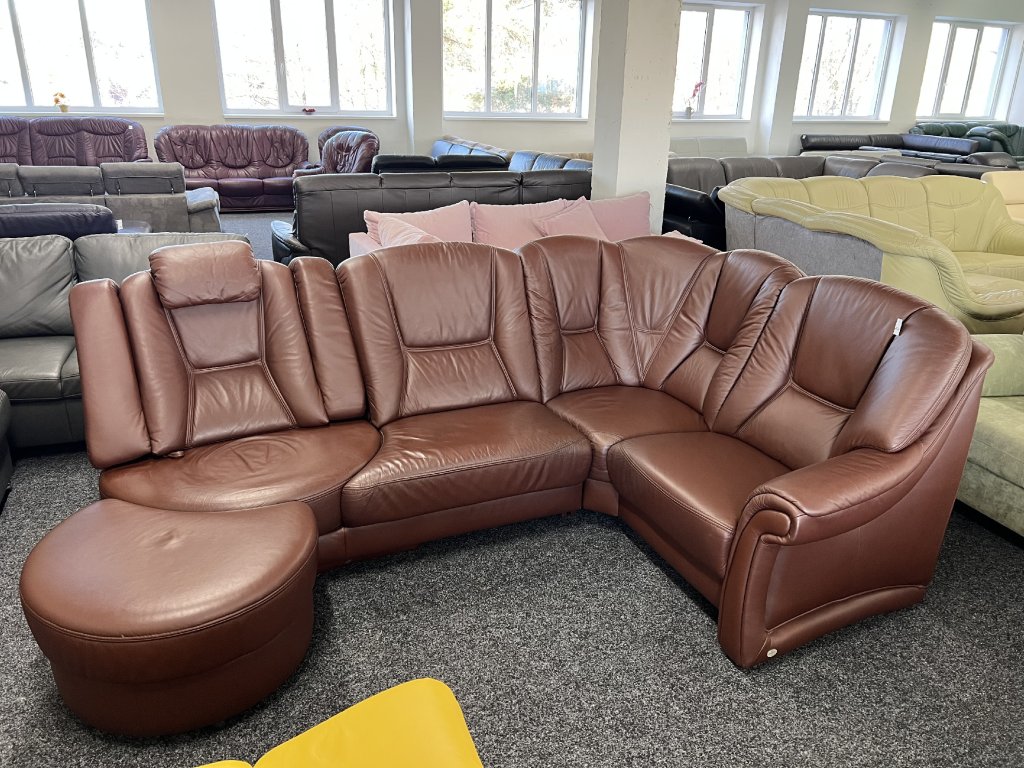 Rohová kožená sedací souprava s otočným zakončením, polohovatelným sedákem a taburetem je určena pro každodenní používání v obytných místnostech.