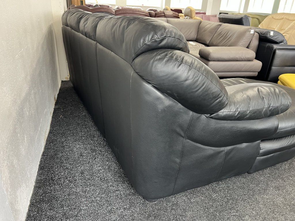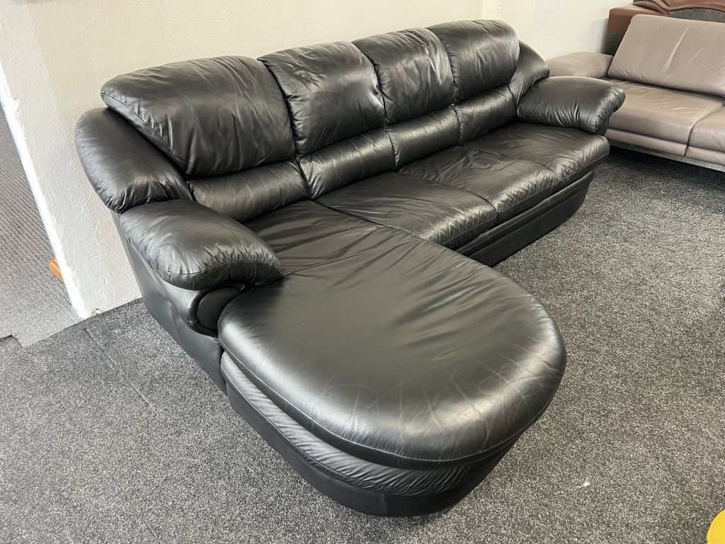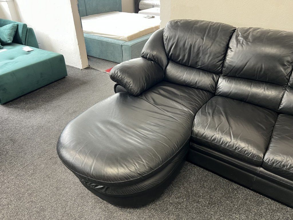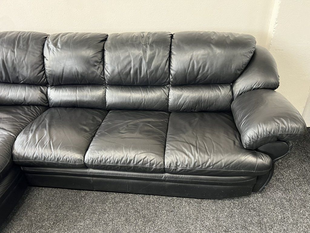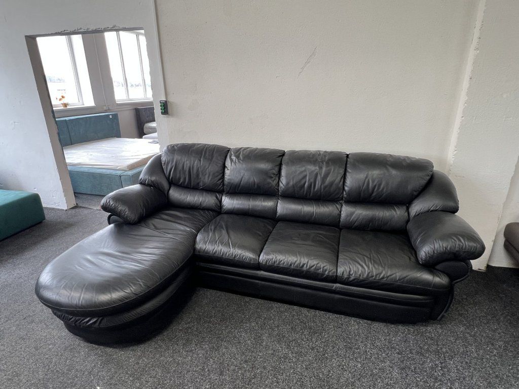 Rohová sedací souprava v koženém provedení, celokožená, ve zánovním stavu. Sestava je řešena do tvaru L s rozšířenou relaxační částí. Konstrukce je celočalouněná, vhodná pro umístění i do prostoru.