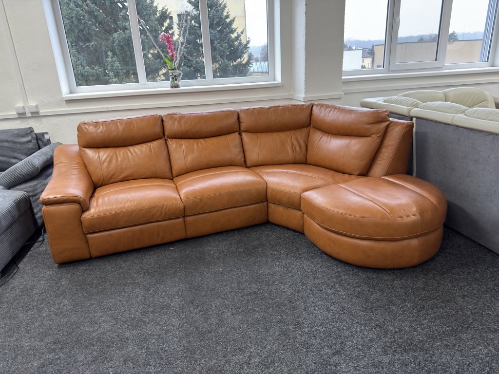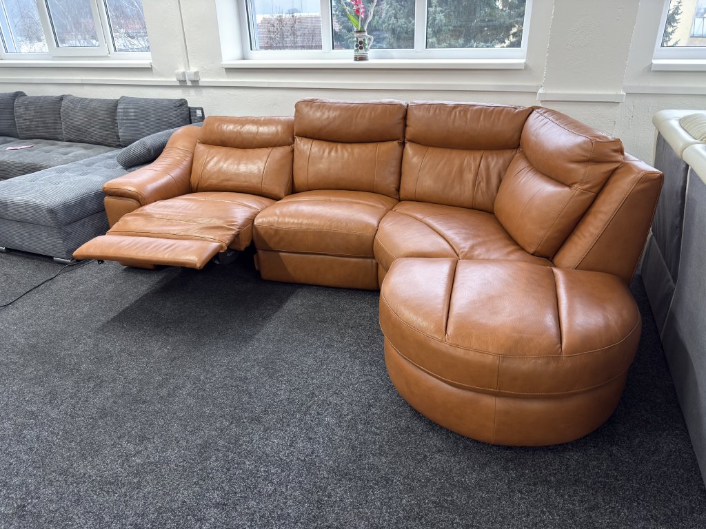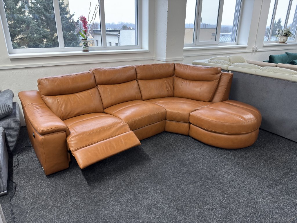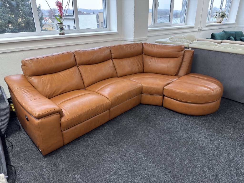 Rohová sedací souprava v koženém provedení s elektrickým polohováním sedu. Součástí sestavy je oddělitelný taburet, který lze variabilně umístit dle prostoru. Sedačka je vhodná do obývacích prostor, kde je požadováno kombinované řešení sezení a relaxační polohy. Stav zánovní.