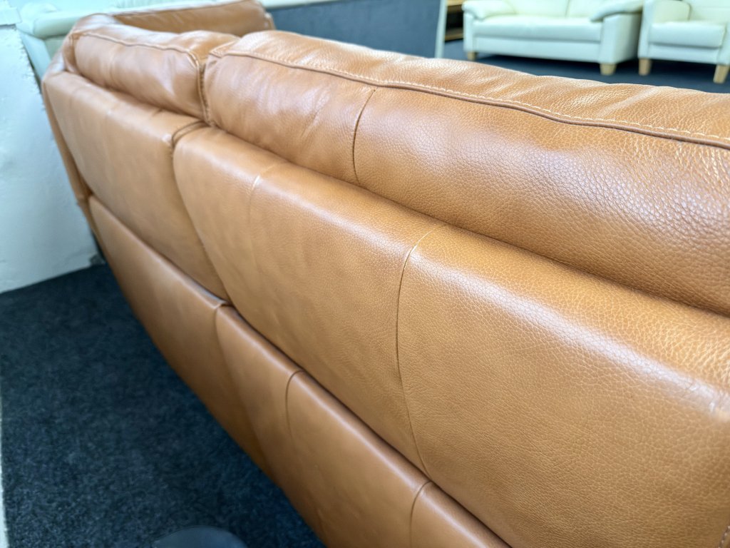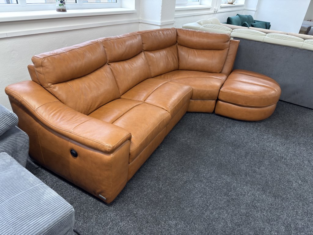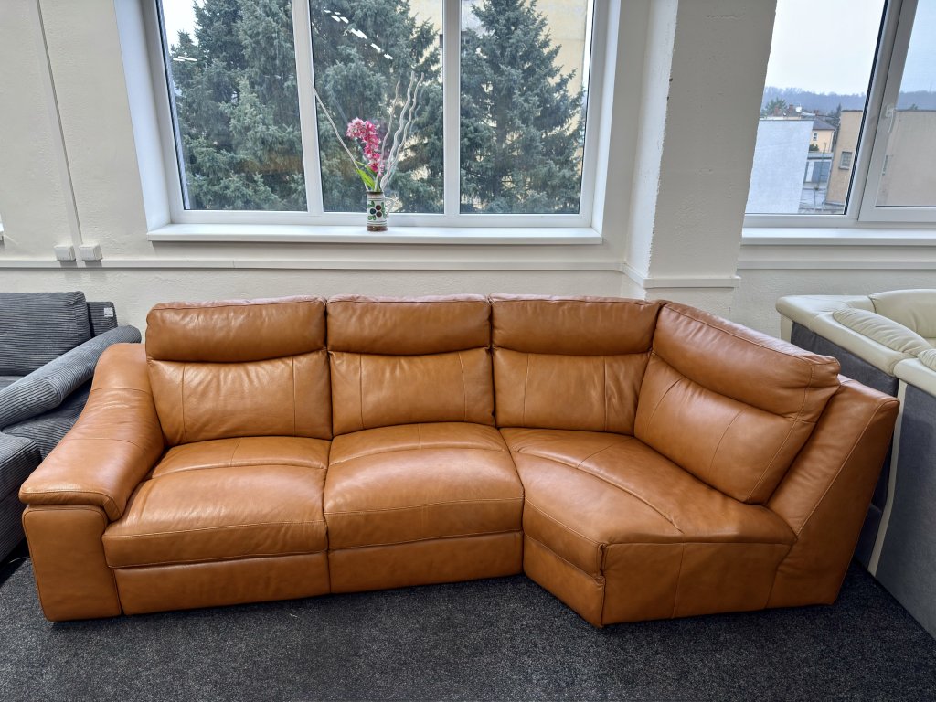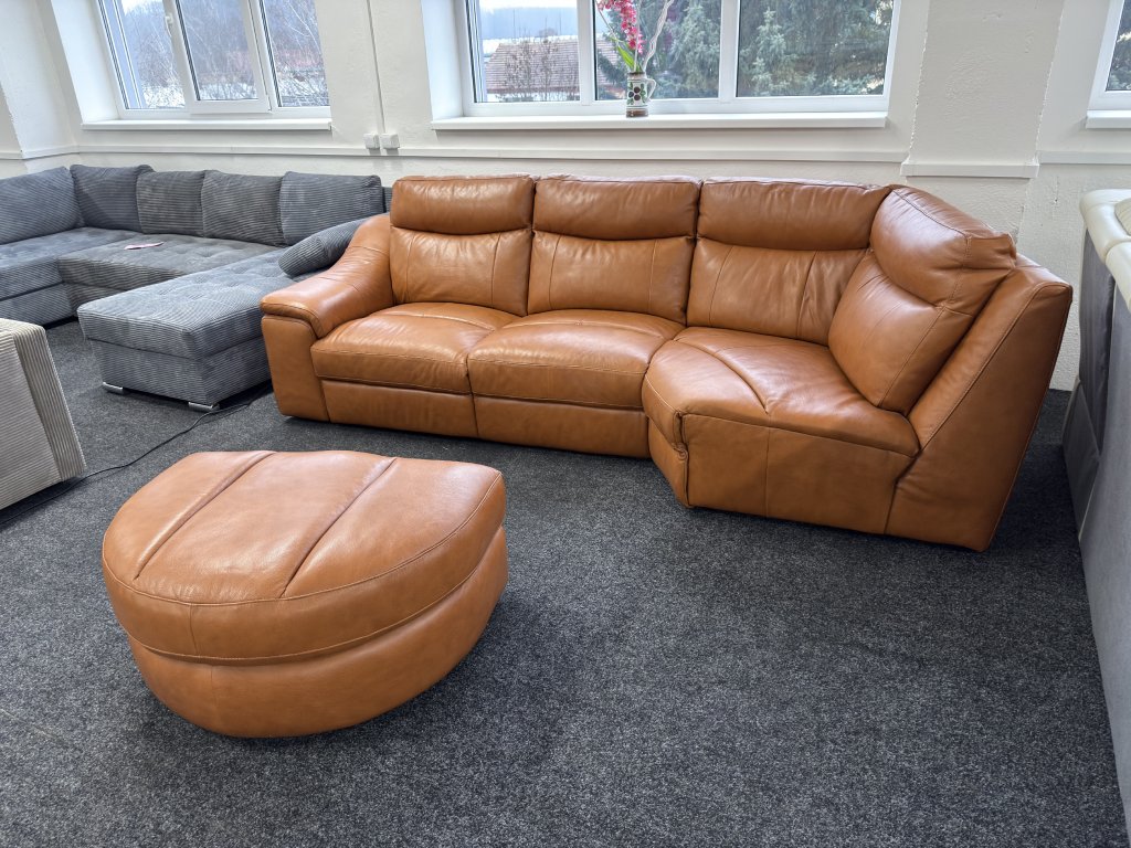 Rohová sedací souprava v koženém provedení s elektrickým polohováním sedu. Součástí sestavy je oddělitelný taburet, který lze variabilně umístit dle prostoru. Sedačka je vhodná do obývacích prostor, kde je požadováno kombinované řešení sezení a relaxační polohy. Stav zánovní.
