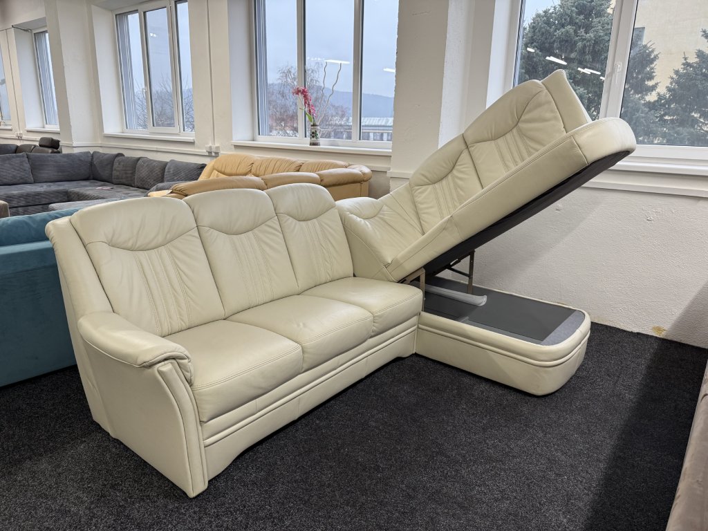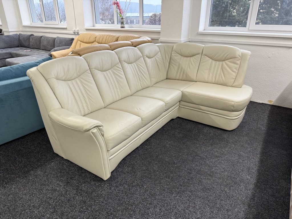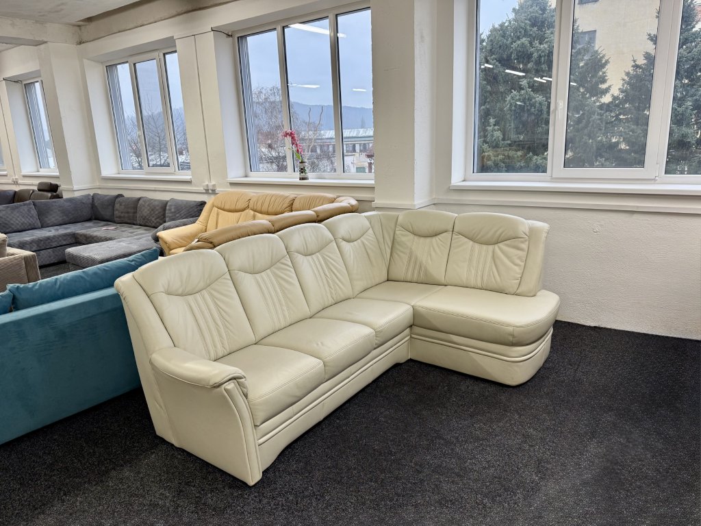 Rohová sedací souprava v koženém provedení se světlým odstínem. Sedačka má klasicky tvarované sedáky a opěrky zad s výrazným prošíváním. Součástí je rohový díl s úložným prostorem. Zadní část není celočalouněná.