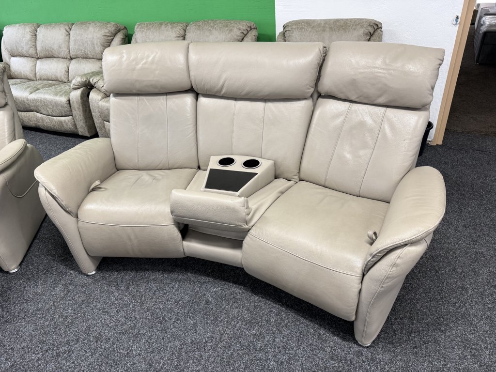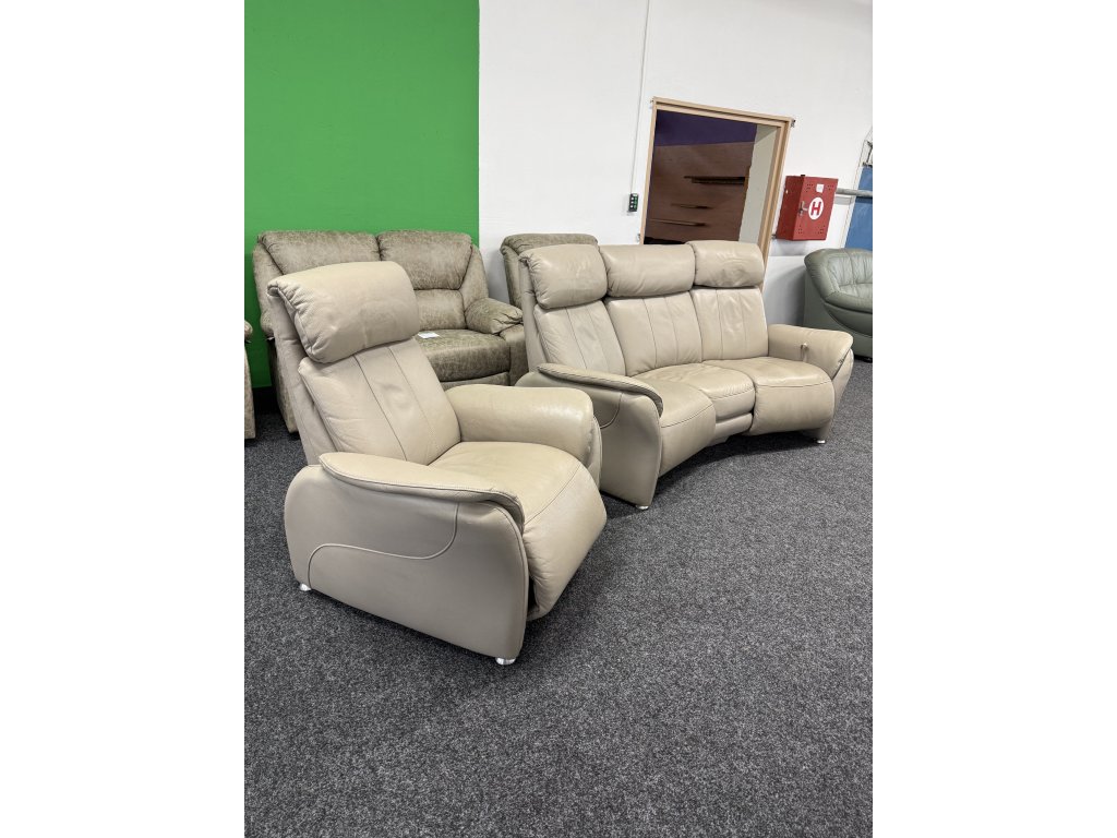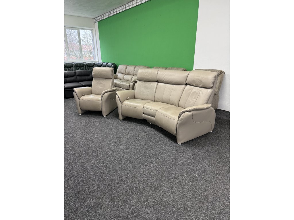 Sedací souprava v sestavě trojsedák + TV křeslo v provedení celokůže. Trojsedák je vybaven výklopným středovým modulem s držáky nápojů. Zánovní stav.