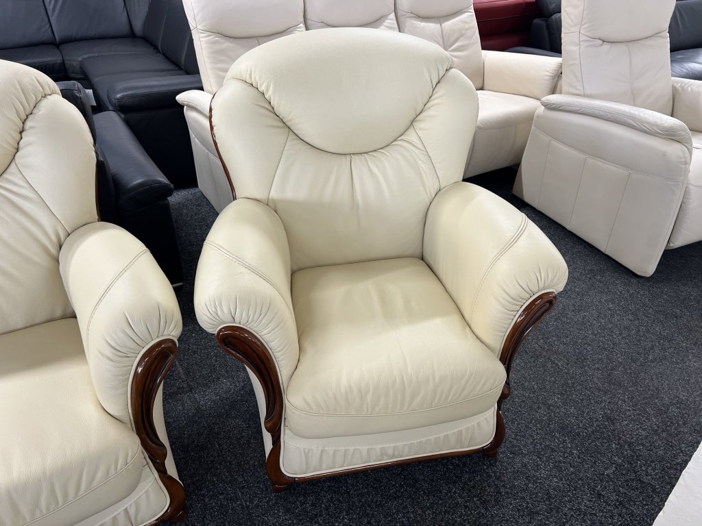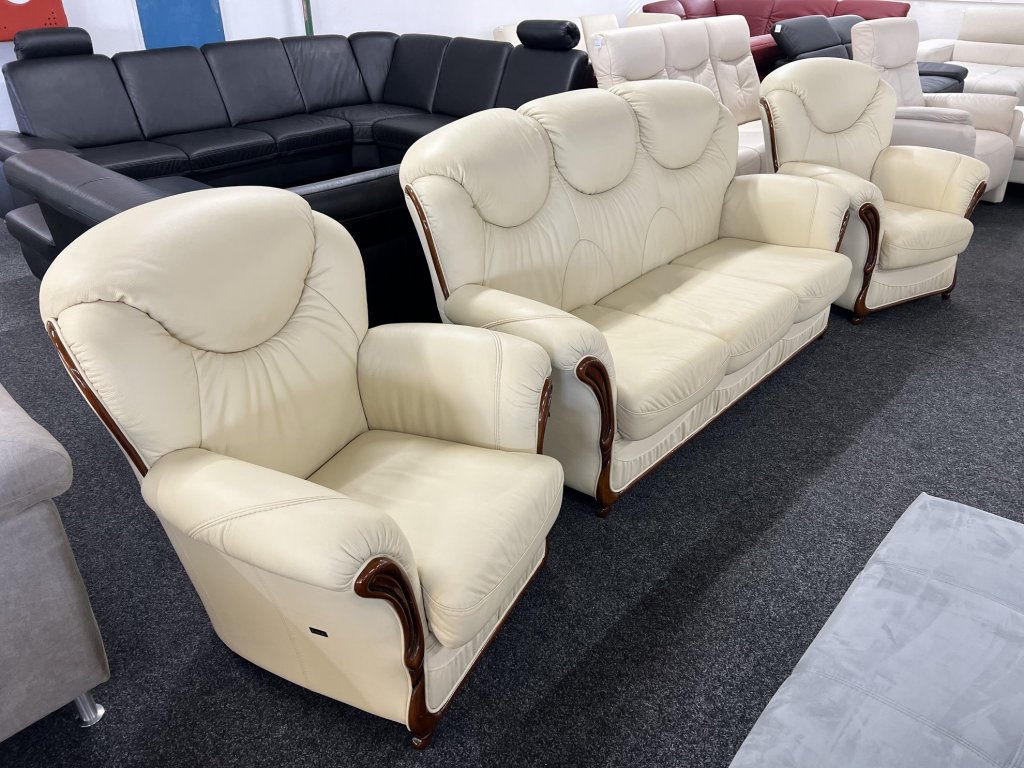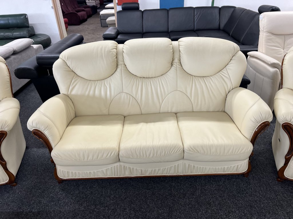 Souprava v klasickém stylu, světlá kůže s tmavým dřevěným rámem. Oblé tvary opěráků a područek vytvářejí vyvážený vzhled vhodný do tradičně laděných interiérů.