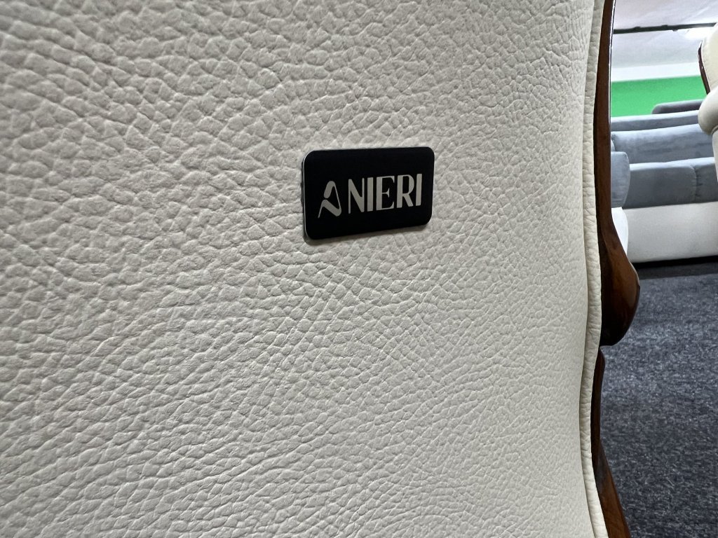 Sedací souprava značky Nieri v provedení 3 + 1 + 1, vyrobená z pravé kůže v světlé barvě. Souprava je celočalouněná a má dřevěné dekorativní prvky v oblasti područek a spodní části. Stav zánovní, bez viditelných známek používání.