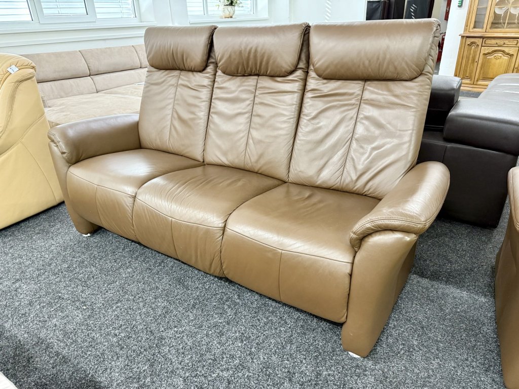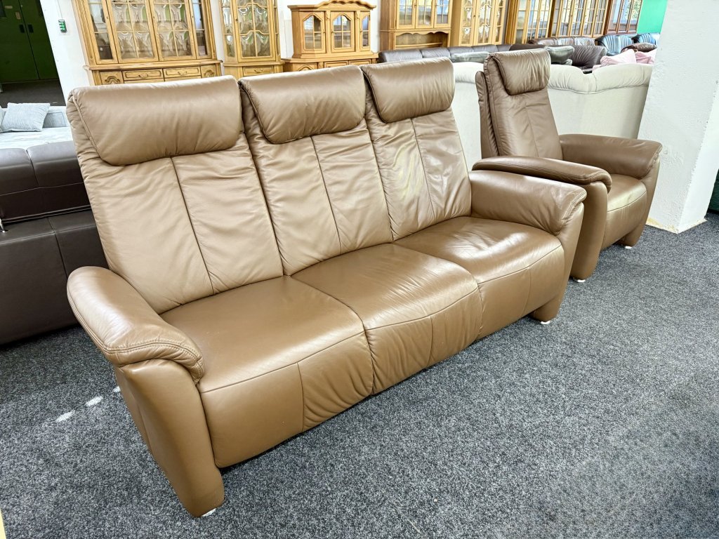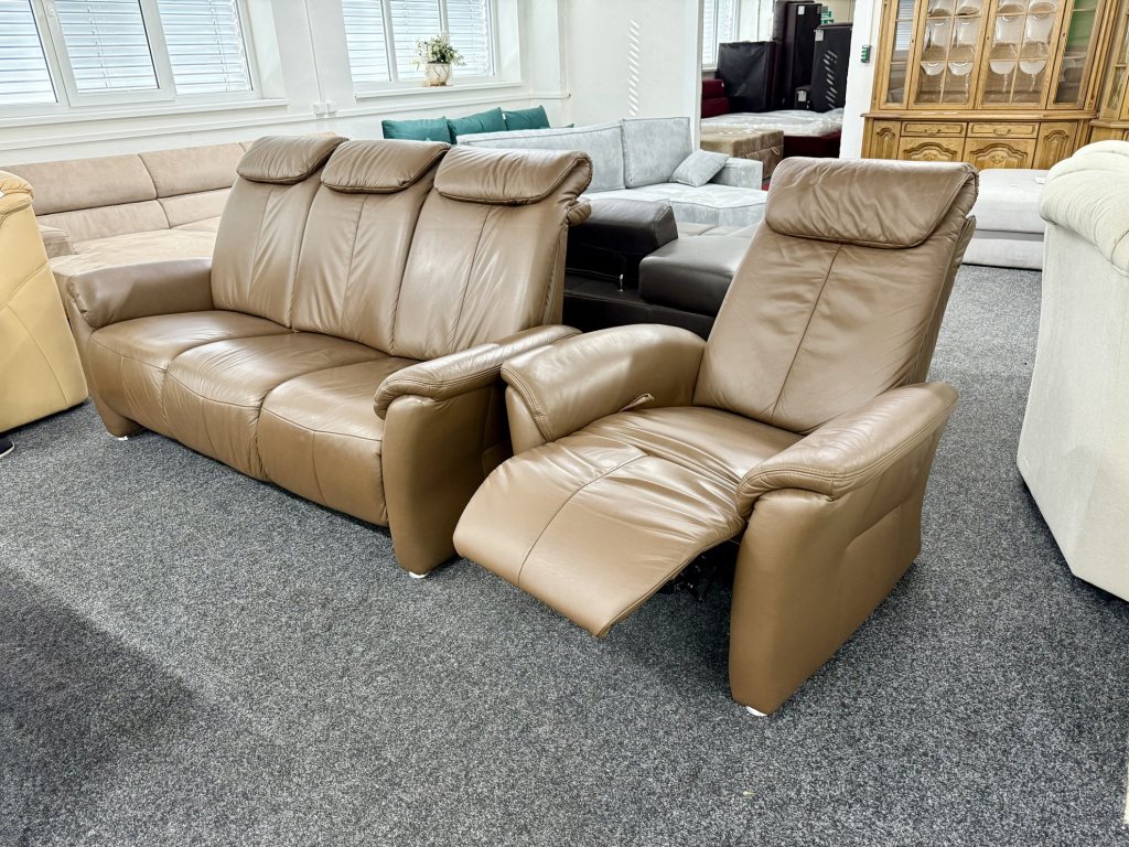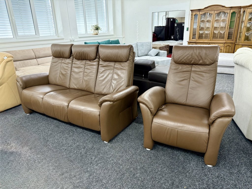 Celočalouněná sedací souprava v hnědém koženém provedení se skládá z trojmístné pohovky a samostatného polohovacího křesla. Souprava je zánovní, bez výrazných známek používání.