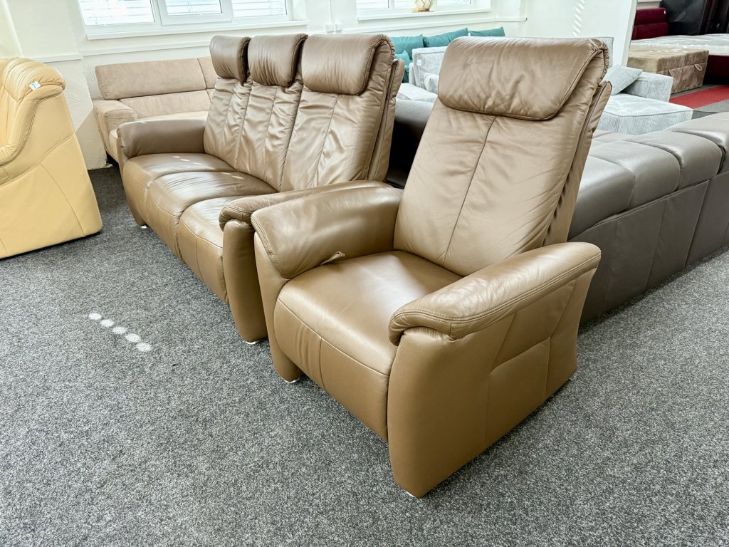 Kožená sedací souprava s vysokým opěradlem a polohovacími funkcemi vhodná pro pohodlné sezení i odpočinek.