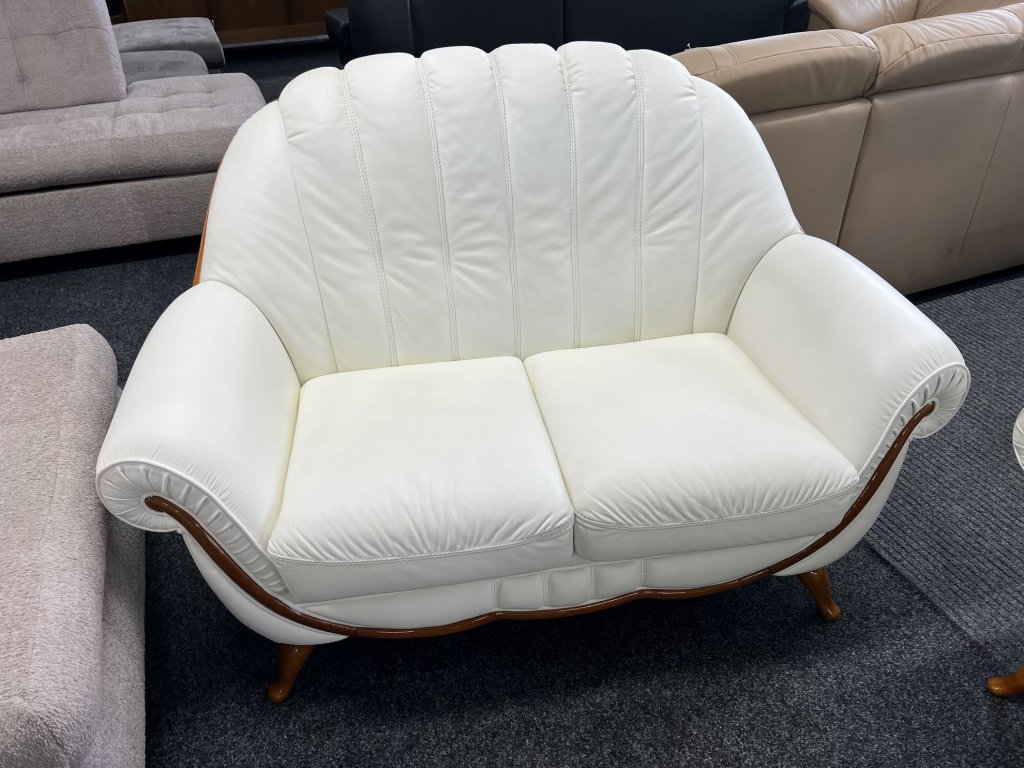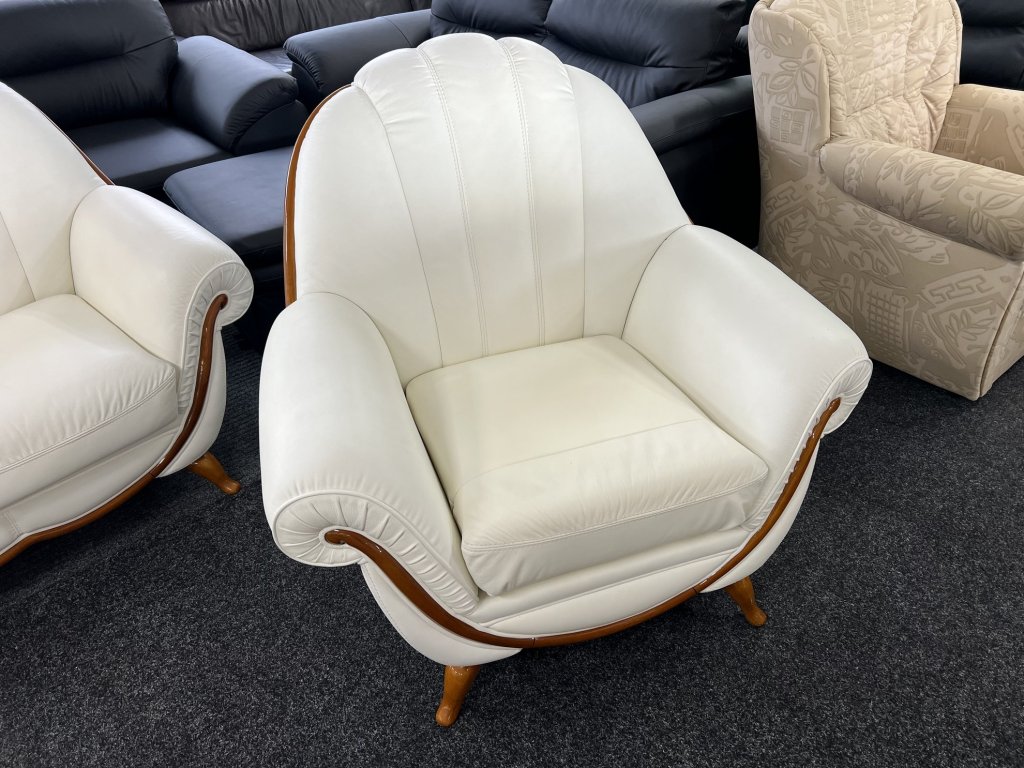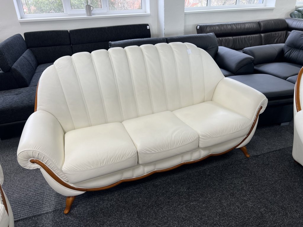 Sedací souprava má klasické tvarování s vysokými opěrkami zad. Kožený potah ve světlém odstínu je doplněn dřevěnými prvky na bocích a nohách jednotlivých dílů.
