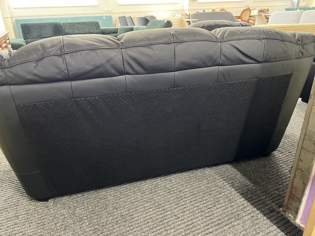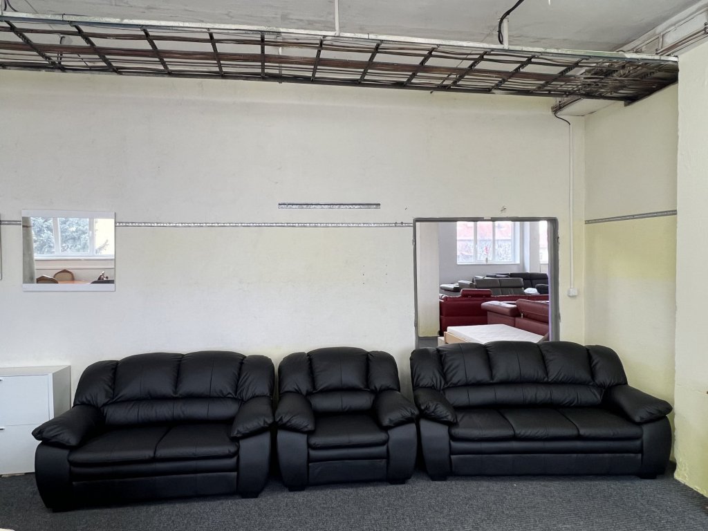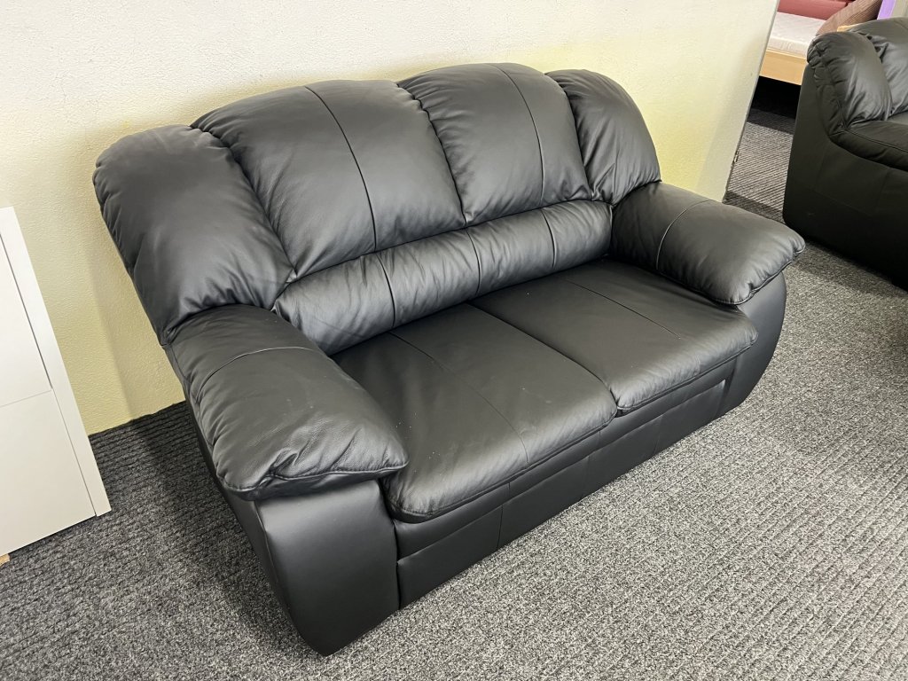 Sedací souprava sestávající z trojmístné pohovky, dvoumístné pohovky a křesla. Potah z kůže v černém barevném provedení. Souprava není celočalouněná, zadní části jsou potaženy technickou tkaninou. Stav nepoužitá. Sestava je vhodná pro samostatné rozmístění jednotlivých prvků v prostoru.
