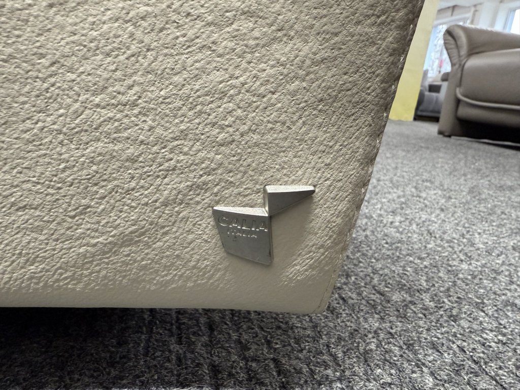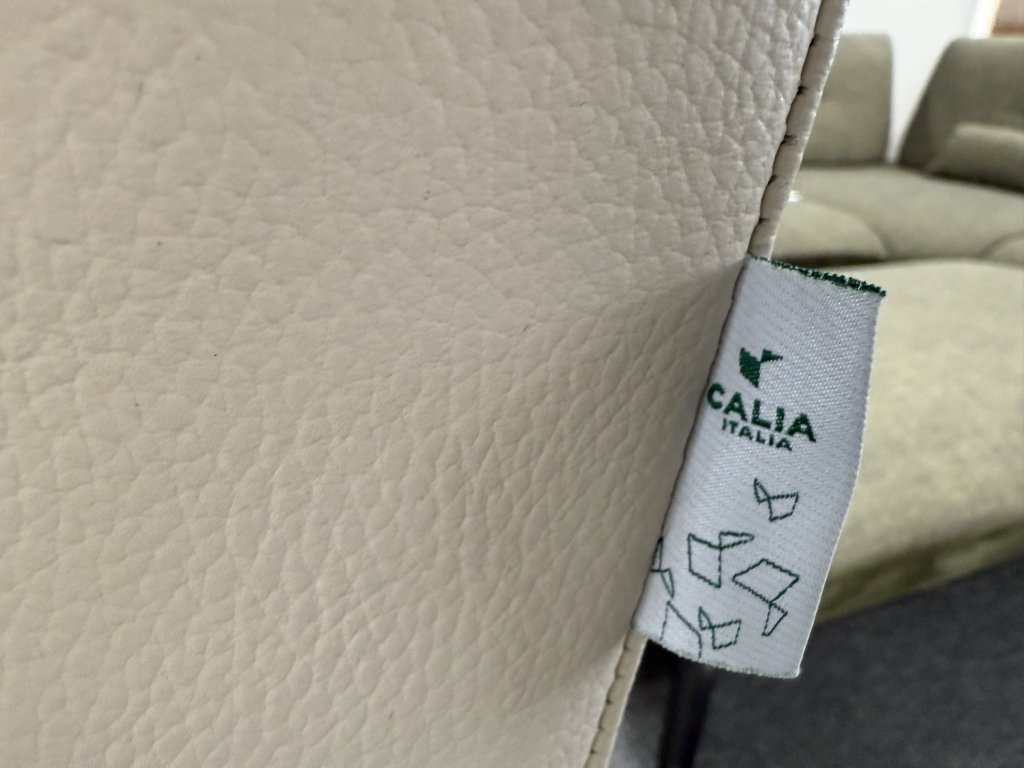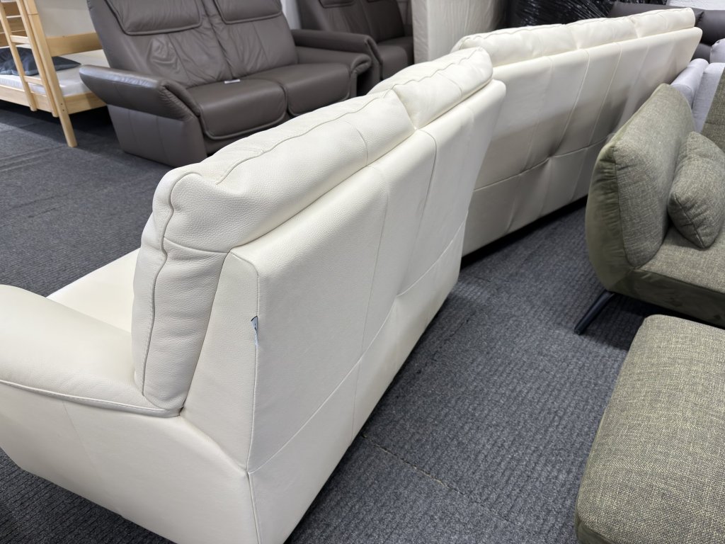 Souprava má tříprvkové složení v jednotném tvarosloví se zaoblenými područkami a členěným opěrným systémem. Povrch tvoří hladká světlá kůže s jemnou strukturou.