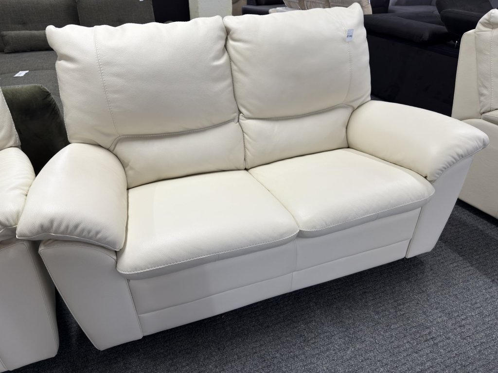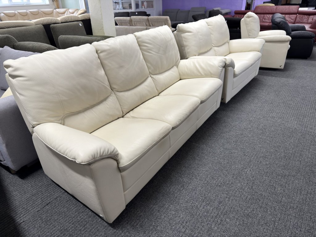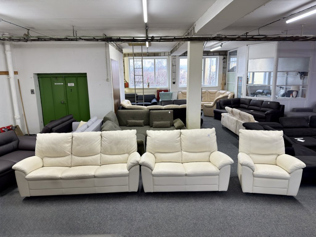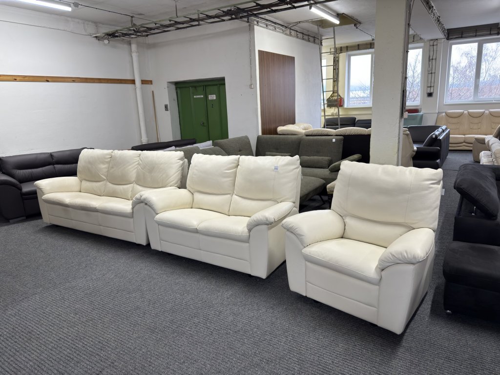 Sedací souprava se skládá z trojmístné pohovky, dvoumístné pohovky a křesla. Souprava je zánovní, v koženém celočalouněném provedení. Nabízí jednotný design, měkčené opěrné části a čalounění v jednolité světlé barvě.