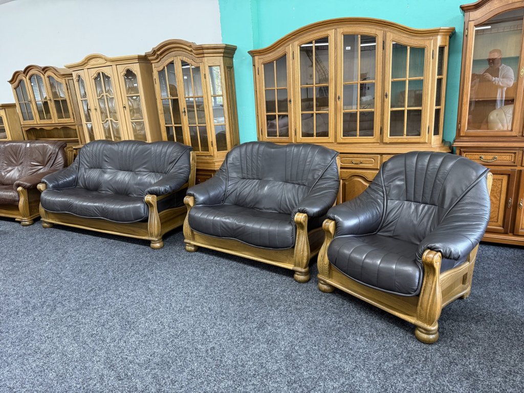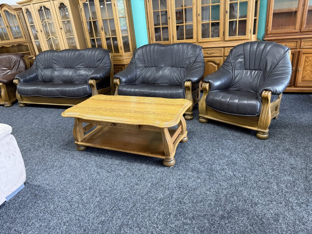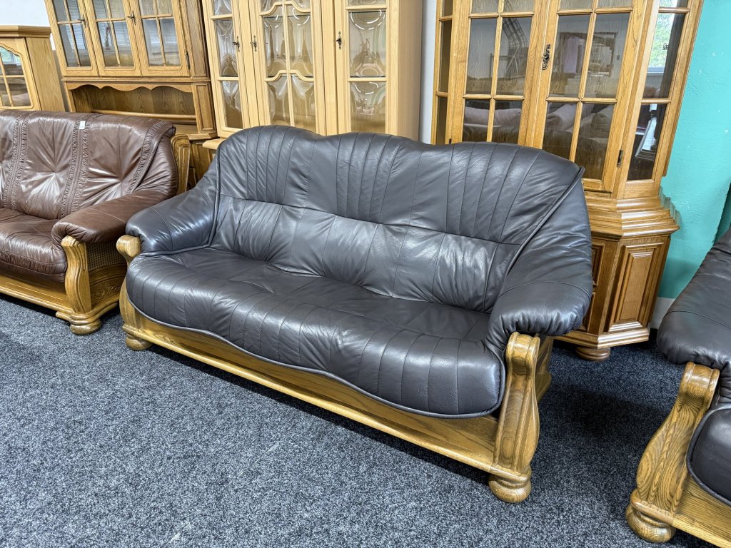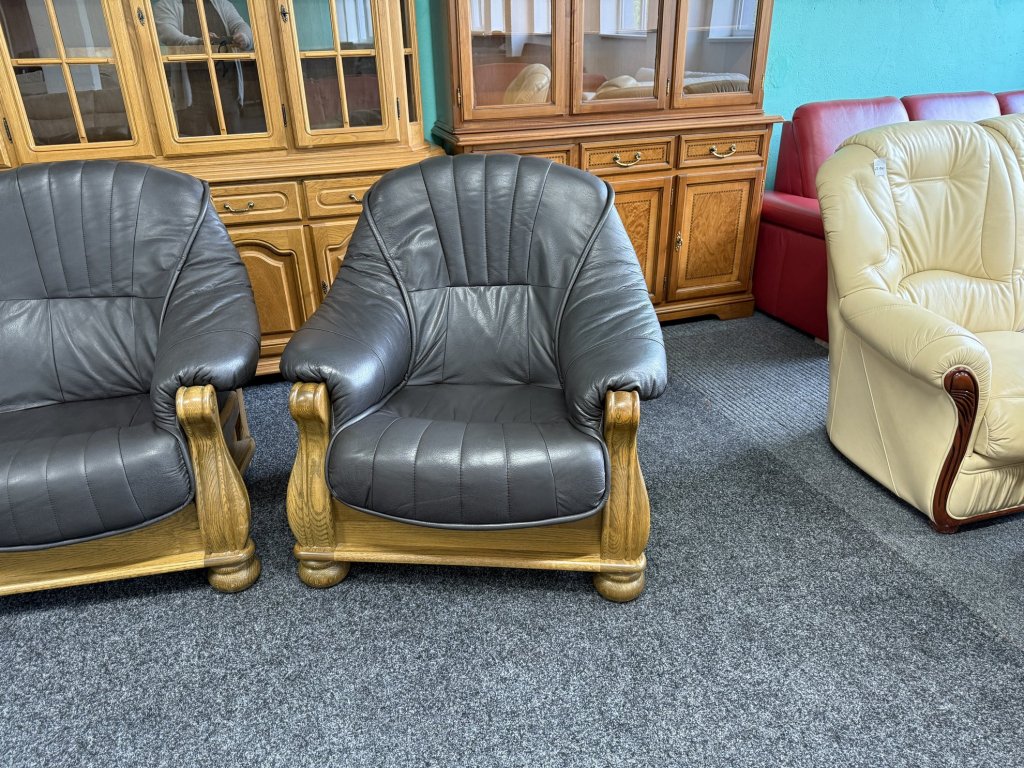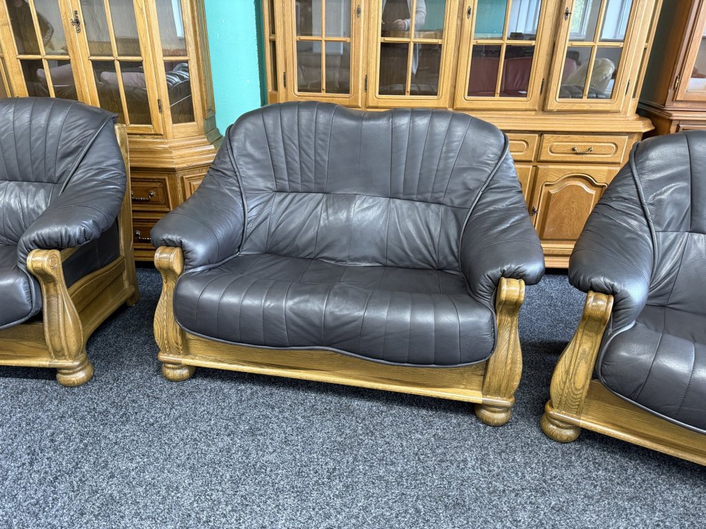 Souprava v rustikálním stylu, kombinace dubového masivu a čalounění z pravé kůže v tmavě šedé barvě. Zaoblené tvary opěráků a područek. -