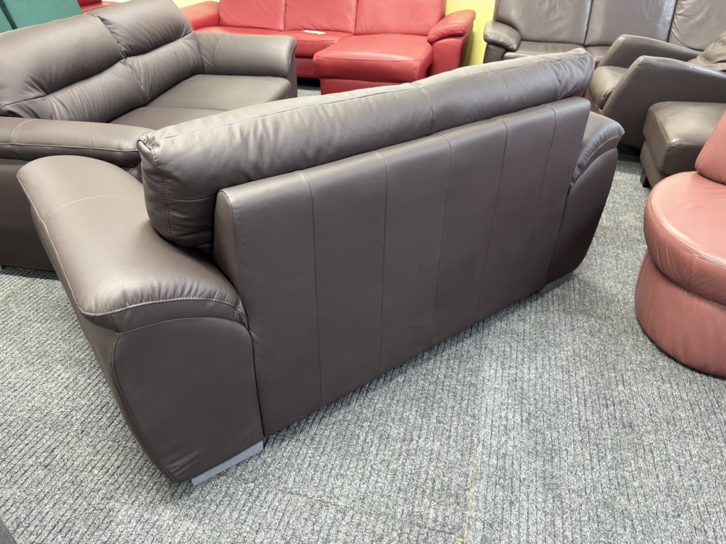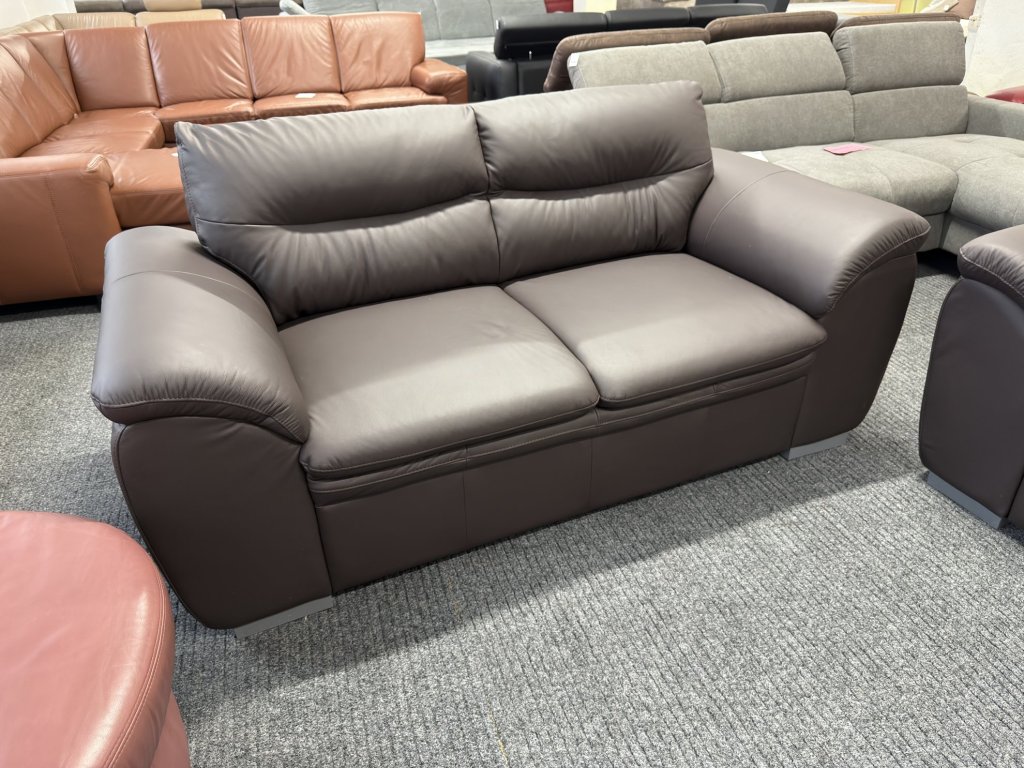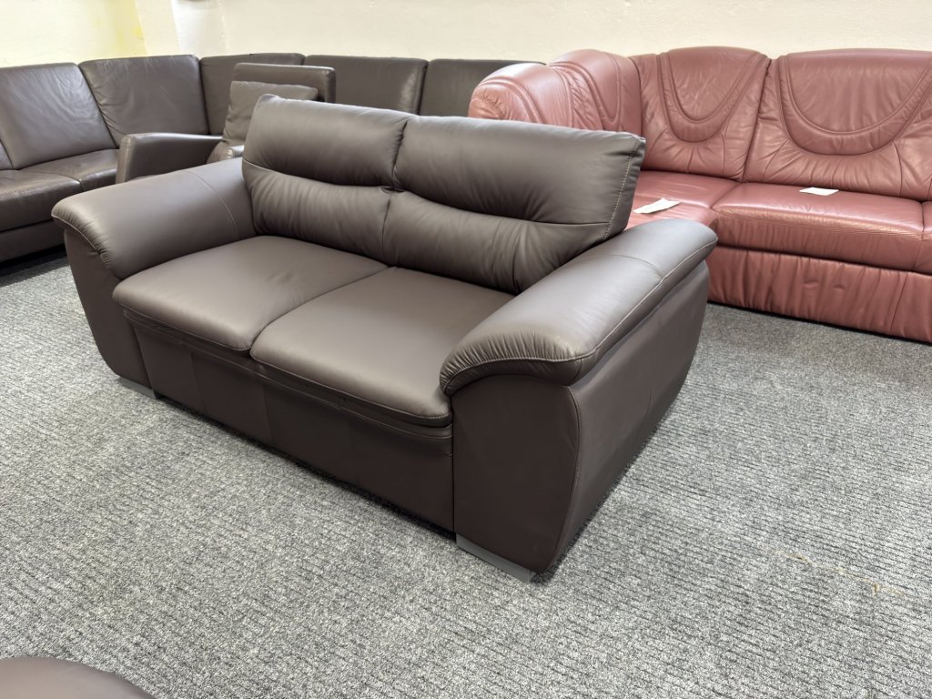 Sedací souprava ve složení trojmístné a dvoumístné pohovky je vyrobena z přírodní kůže. Zadní část není celočalouněná. Souprava je nepoužitá.
