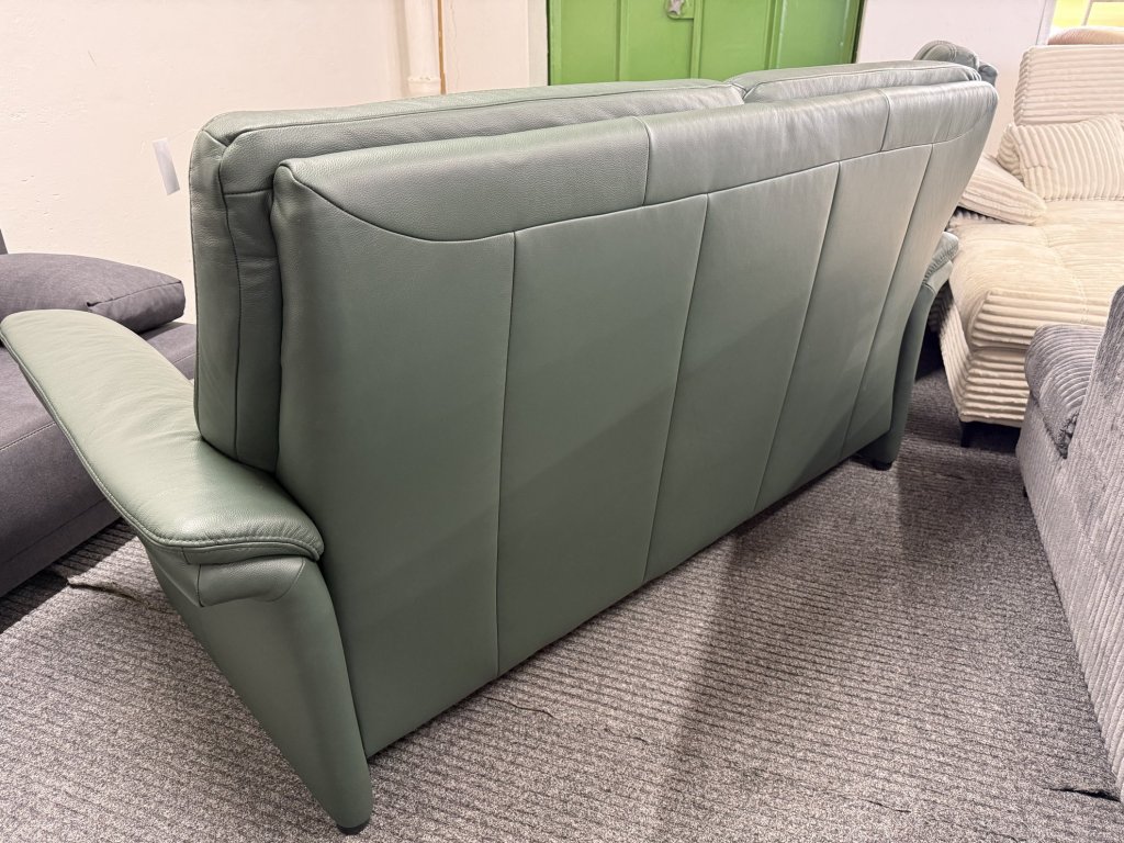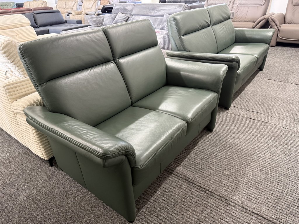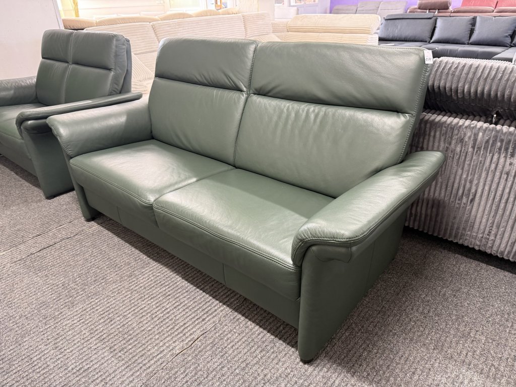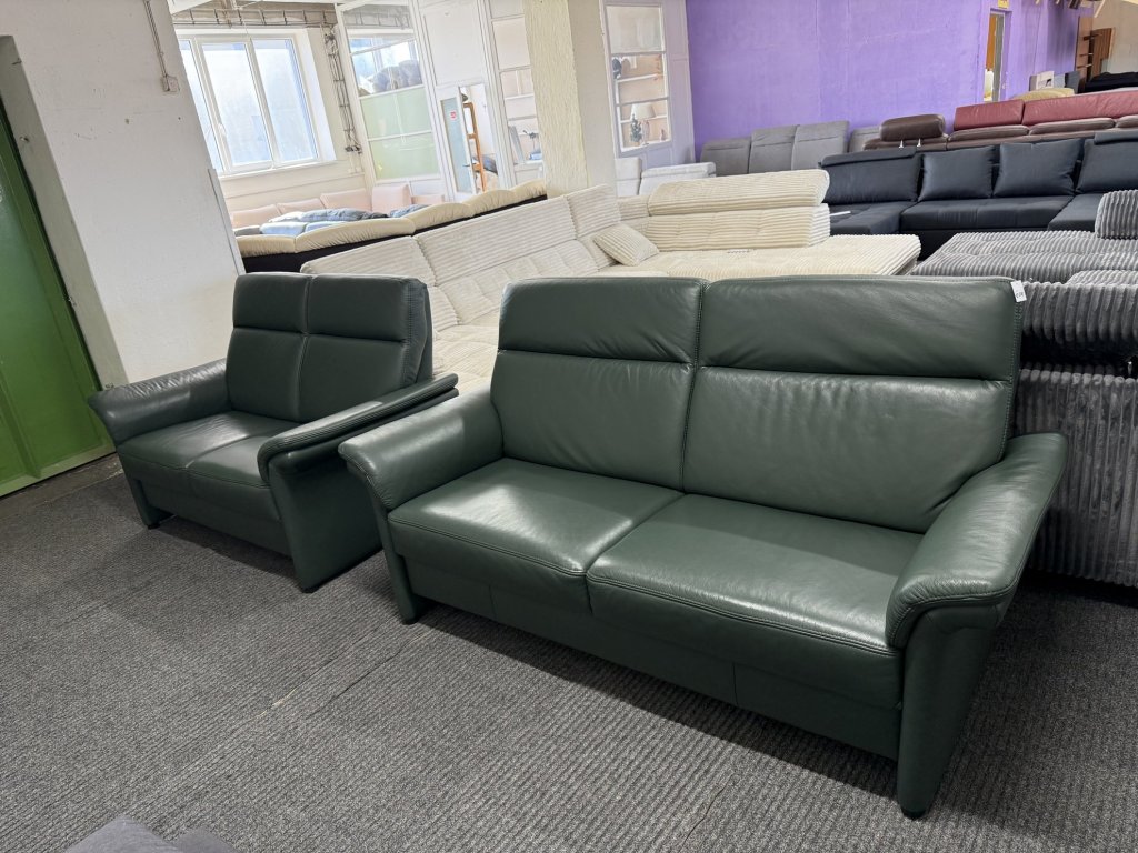 Sedací souprava v sestavě trojka a dvojka. Provedení v kůži v tmavě zeleném odstínu. Zánovní stav, celočalouněná záda umožňují umístění i do prostoru.