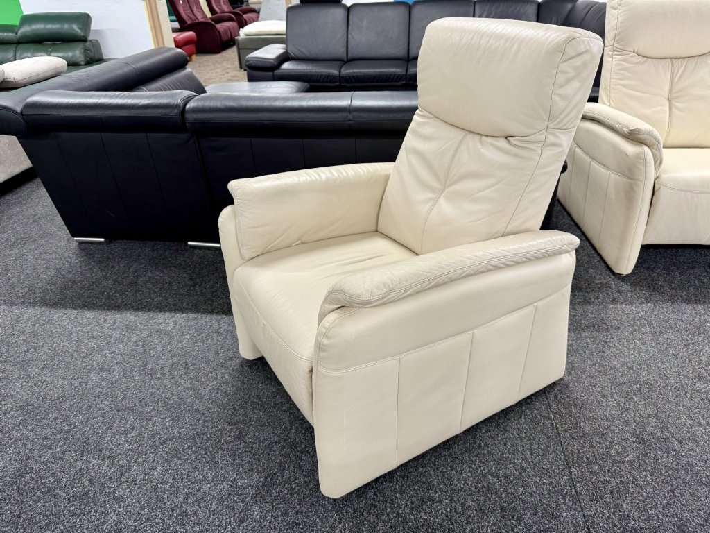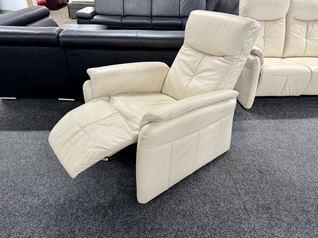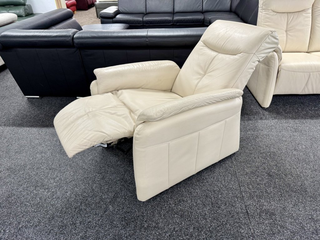 Zánovní celokožená sedací souprava 3 + 1 v béžovém provedení nabízí kvalitní materiál, nadčasový vzhled a pohodlné sezení s možností polohování.