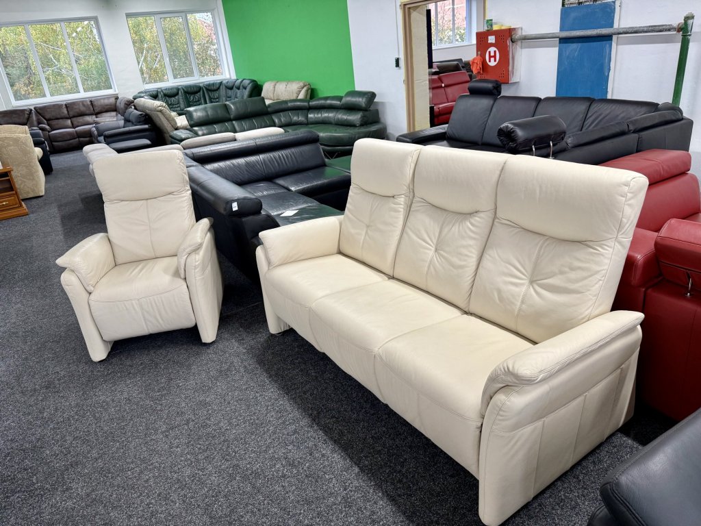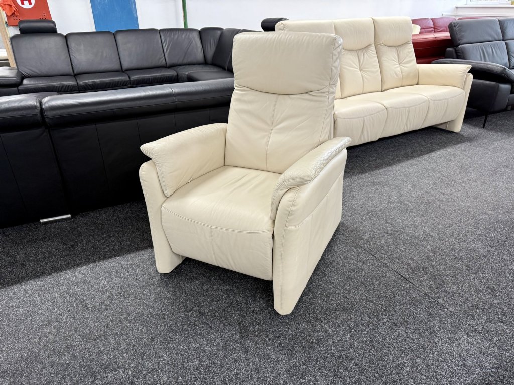 Elegantní celokožená sedací souprava se skládá z trojmístné pohovky a samostatného křesla. Jemná béžová barva působí vzdušně a univerzálně, vhodně doplní světlé i tmavé interiéry. Čisté linie a lehce tvarované opěrné části zajišťují vyvážený a nadčasový vzhled.