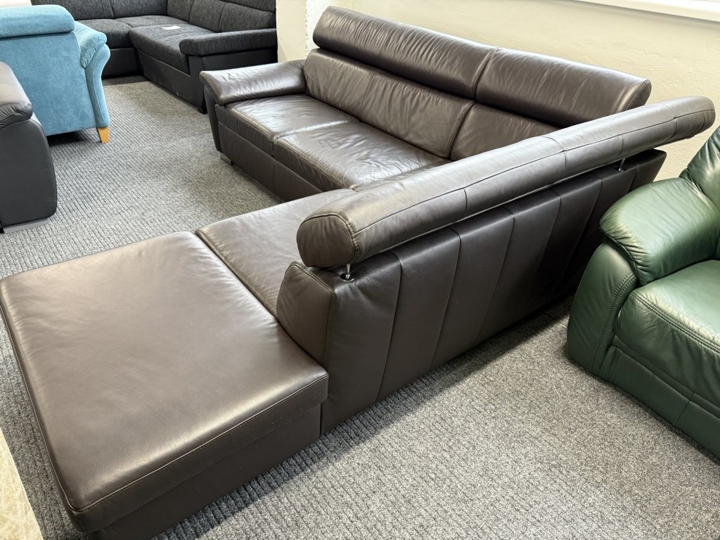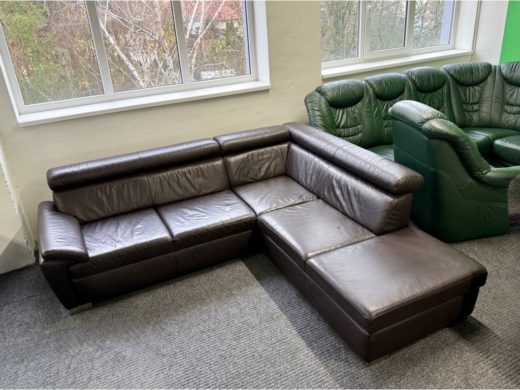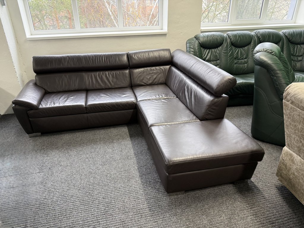 Rohová sedací souprava v koženém provedení, celočalouněná, s polohovacími opěrkami hlavy. Souprava je ve stavu zánovní. Konstrukce je řešena jako pravý roh.