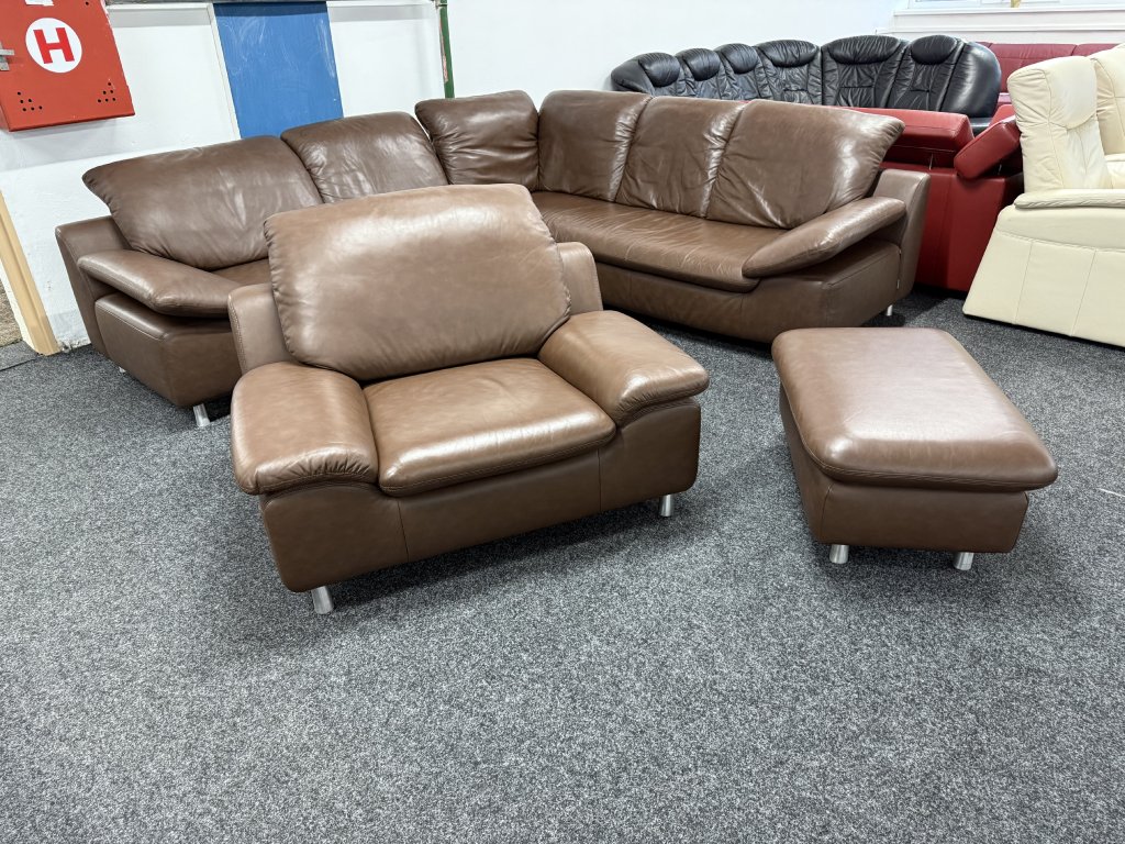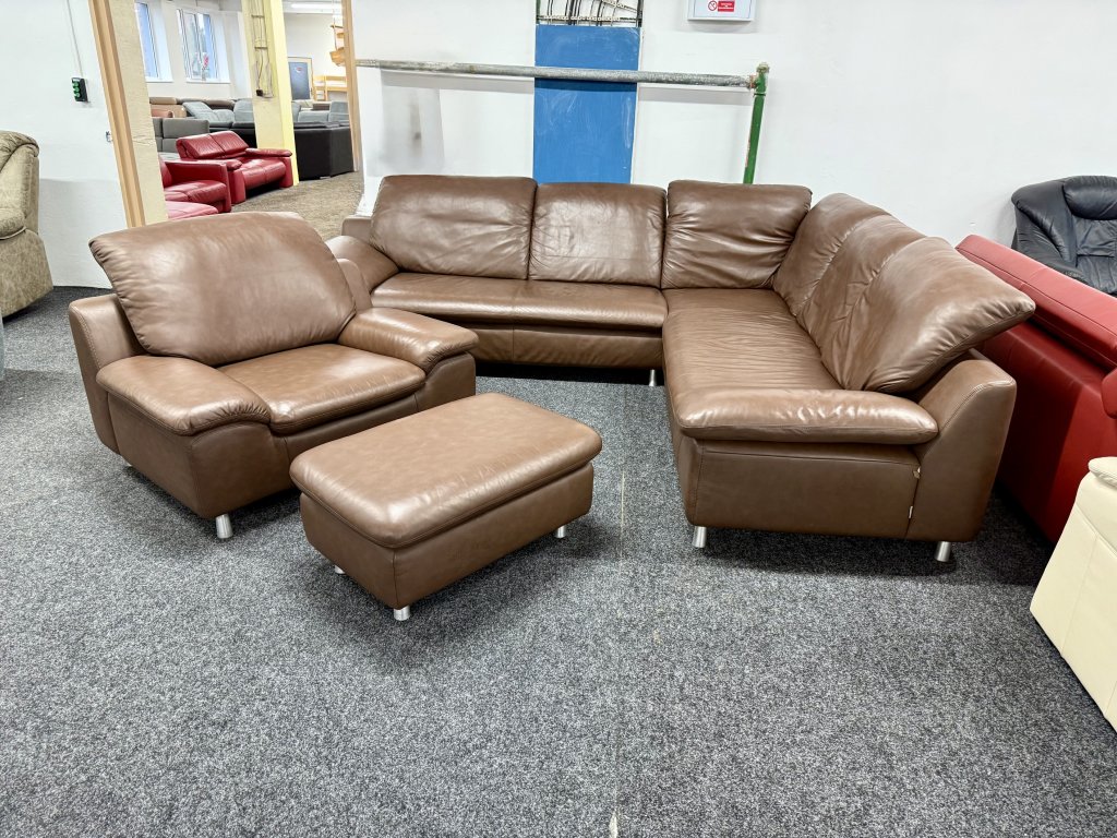 Značková rohová sedací souprava W. Schillig v koženém provedení, doplněná o samostatné křeslo a taburet. Sestava nabízí souvislou sedací plochu a vyšší opěrné části vhodné pro každodenní používání.