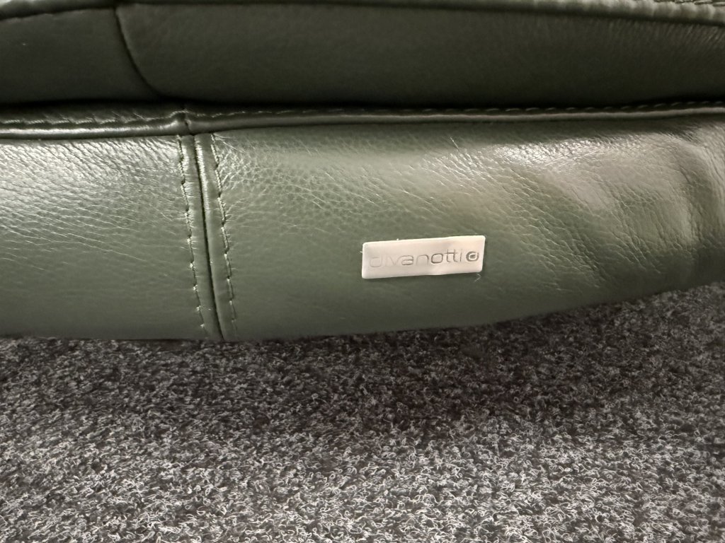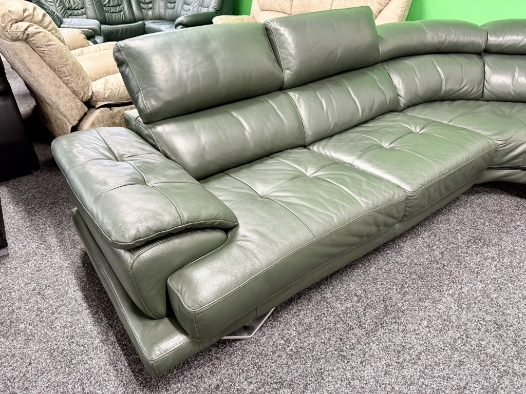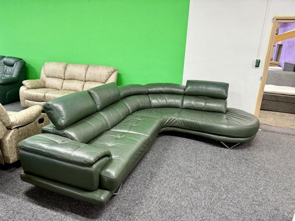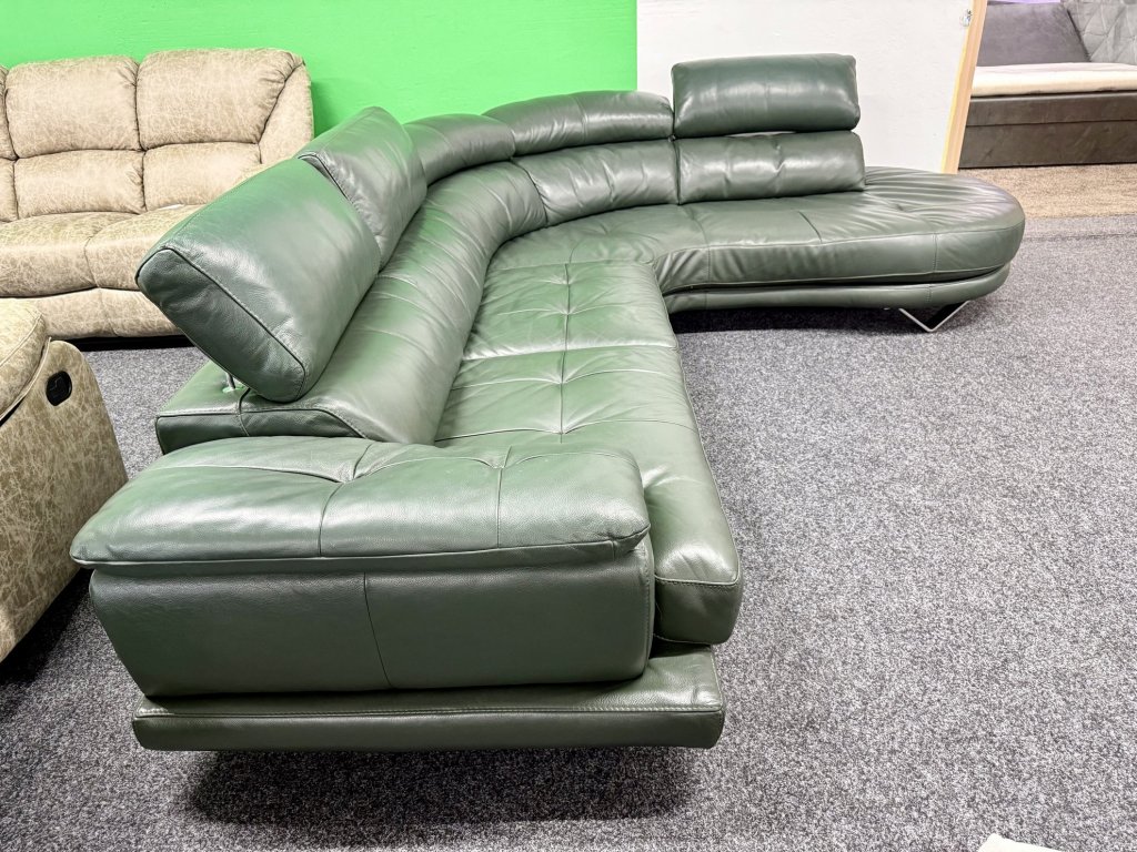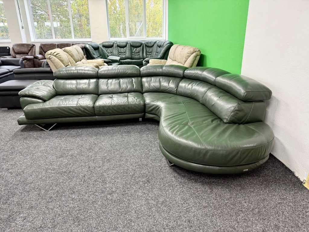 Moderní rohová sedací souprava značky Divanotti zaujme elegantním tvarem s plynulými liniemi a ladně zaobleným rohem. Čalounění z pravé kůže v tmavě zeleném odstínu dodává sedačce výrazný, ale zároveň decentní vzhled. Polohovací opěrky hlavy zajišťují komfortní oporu při sezení a dotvářejí moderní vzhled.