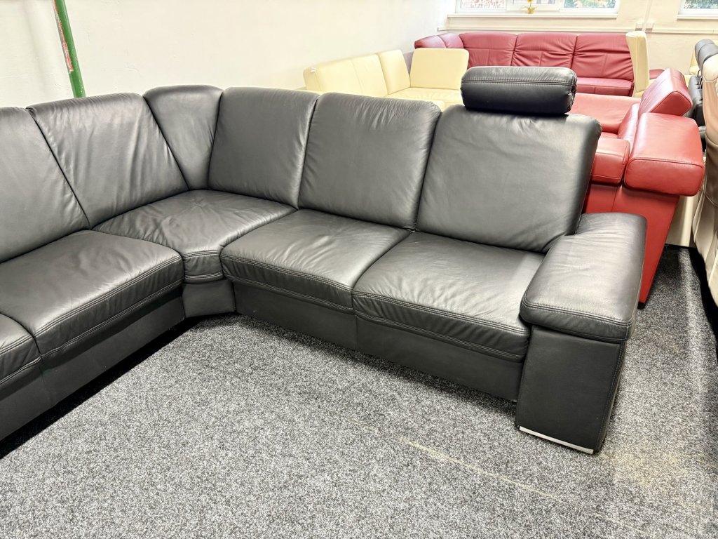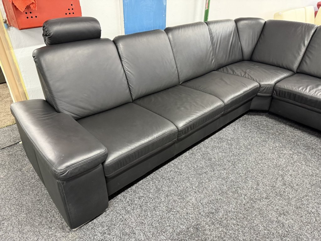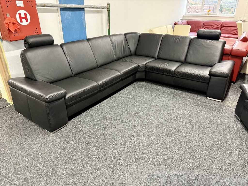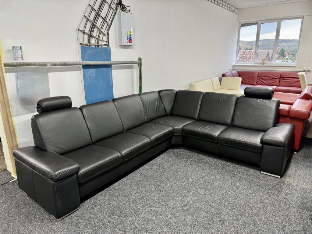 Zánovní kožená rohová sedací souprava v černém provedení nabízí komfortní sezení, kvalitní zpracování a nadčasový design vhodný do moderního interiéru.