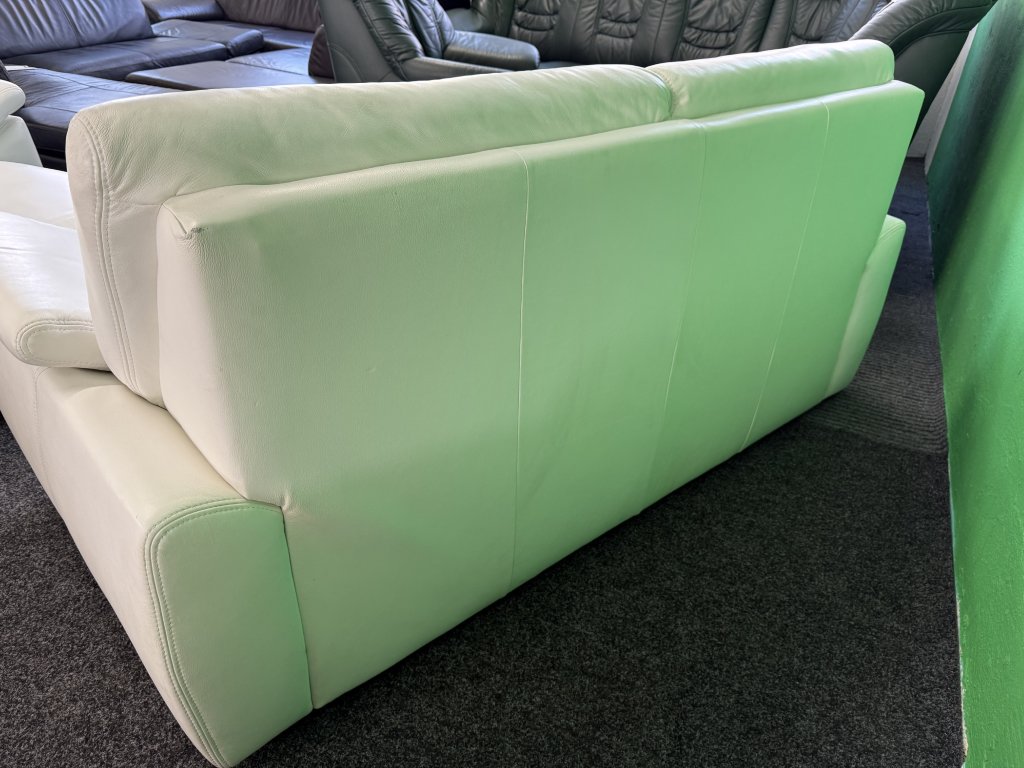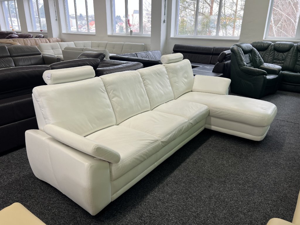 Sedací souprava v rohovém provedení doplněná samostatnou pohovkou. Kožené čalounění, zánovní stav. Provedení není celočalouněné. Součástí jsou polohovatelné područky.