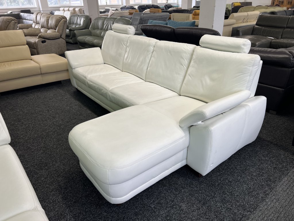 Sestava je čalouněna světlou kůží. Opěradla jsou hladká, bez výrazného prošívání. Područky mají možnost polohování. Rohová část je zakončena prodlouženým sedákem. Samostatná pohovka designově navazuje na rohový díl.