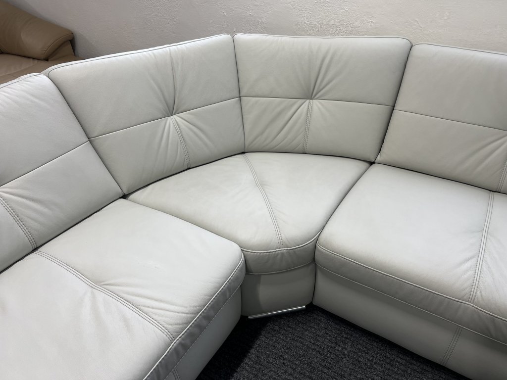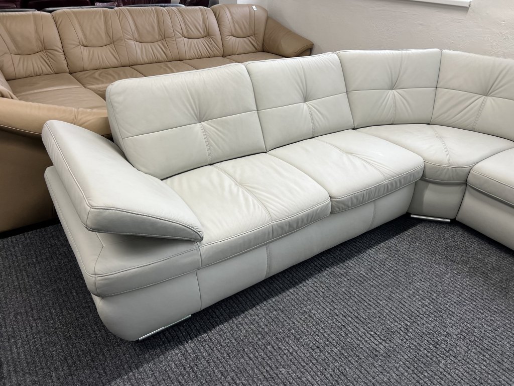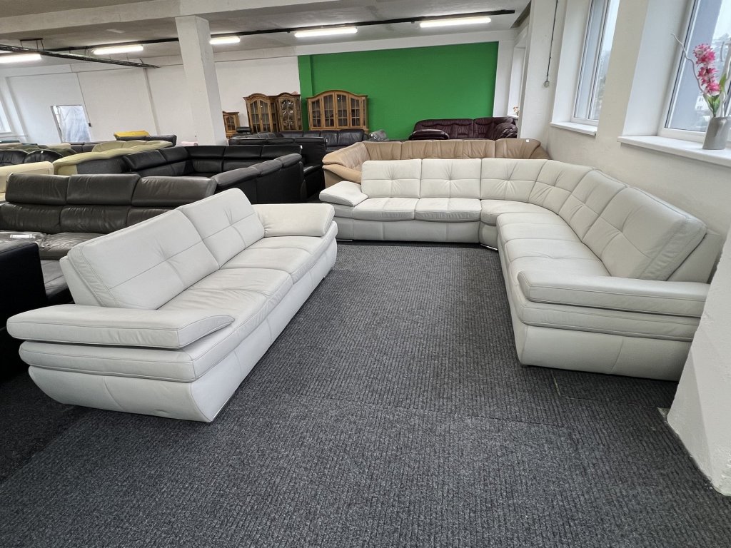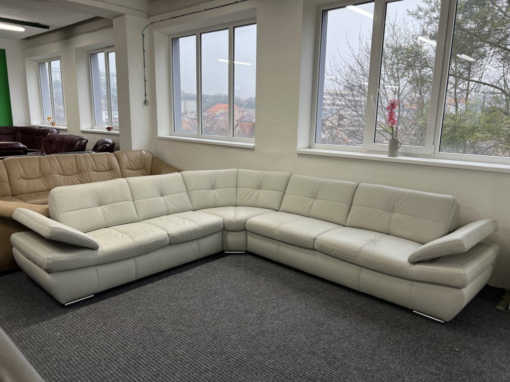 Rohová sedací souprava doplněná samostatnou pohovkou v koženém provedení. Sedačka je celočalouněná, vhodná pro umístění do prostoru. Područky jsou polohovací. Stav zánovní.