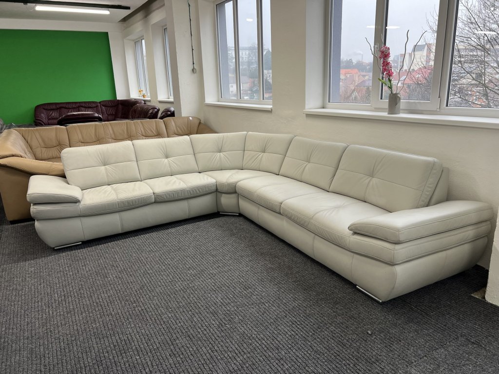 Rohová sedací souprava s pohovkou v koženém provedení nabízí rozsáhlou sedací plochu a variabilní uspořádání jednotlivých dílů. Vhodná pro prostornější interiéry.