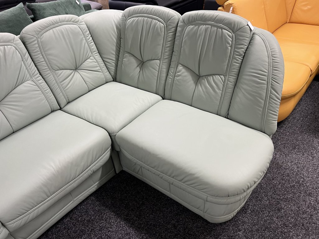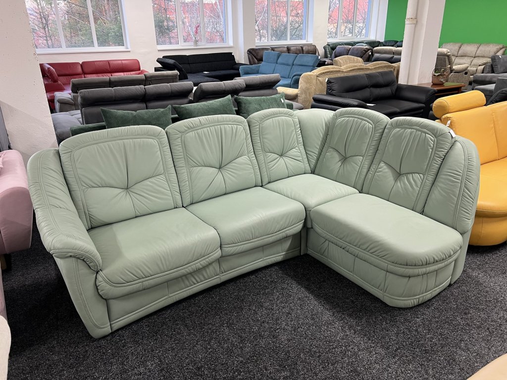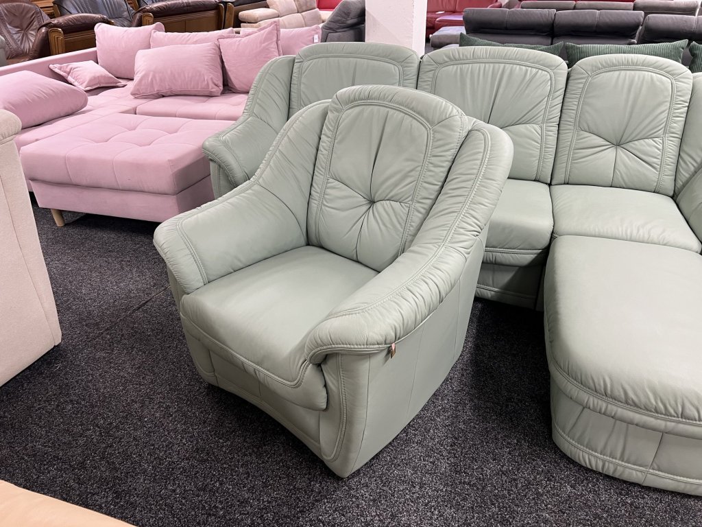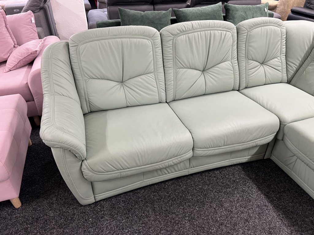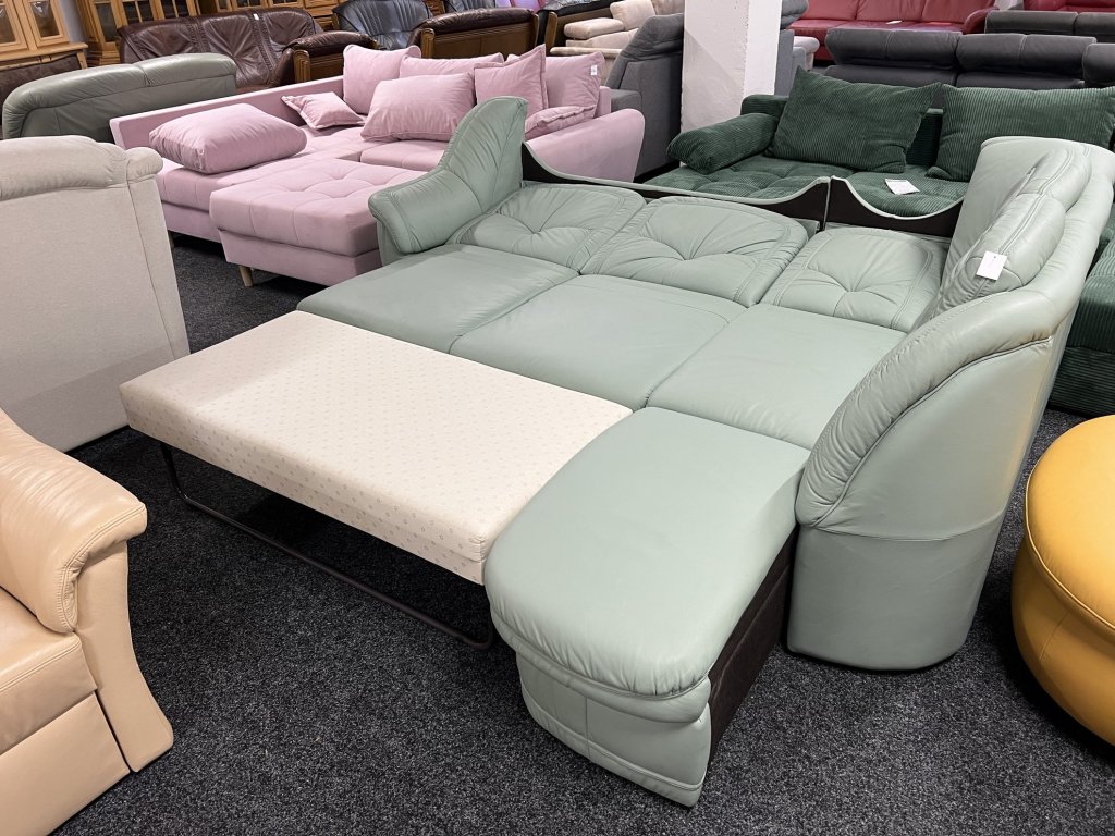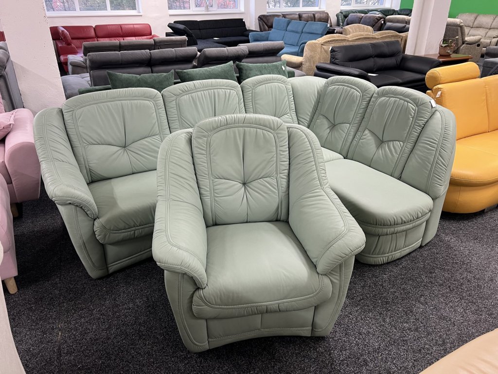 Souprava je vyrobena z měkké přírodní kůže ve světle zeleném odstínu. Tvarově je řešena s vyššími opěrnými plochami a měkčenými područkami. Výsuvný rozklad poskytuje spací plochu 180 × 200 cm. V boční části je úložný prostor přístupný vyklopením. Součástí sestavy je samostatné křeslo ve stejném designu.